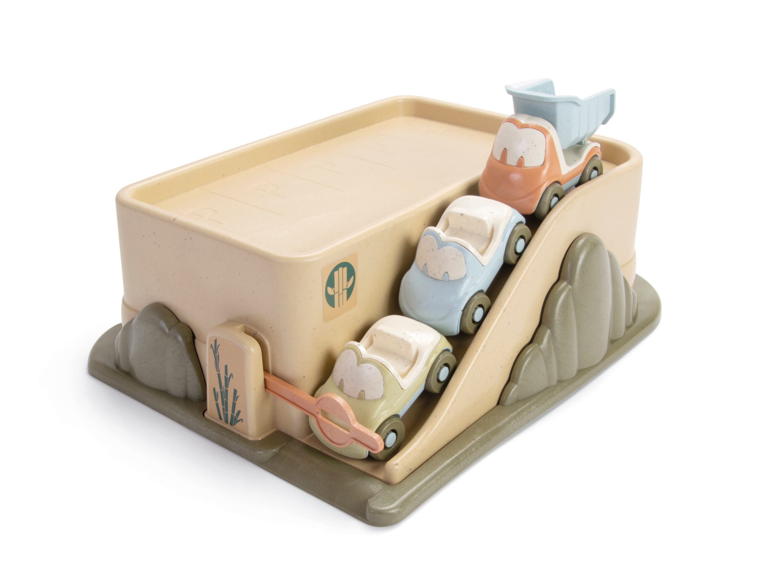 Bio garaža u pastelnim bojama s tri malena auta. Lako se čisti u perilici posuđa. Pogodno za igru na unutarnjem i vanjskom prostoru. 90 % sadržaja je šećerna trska.