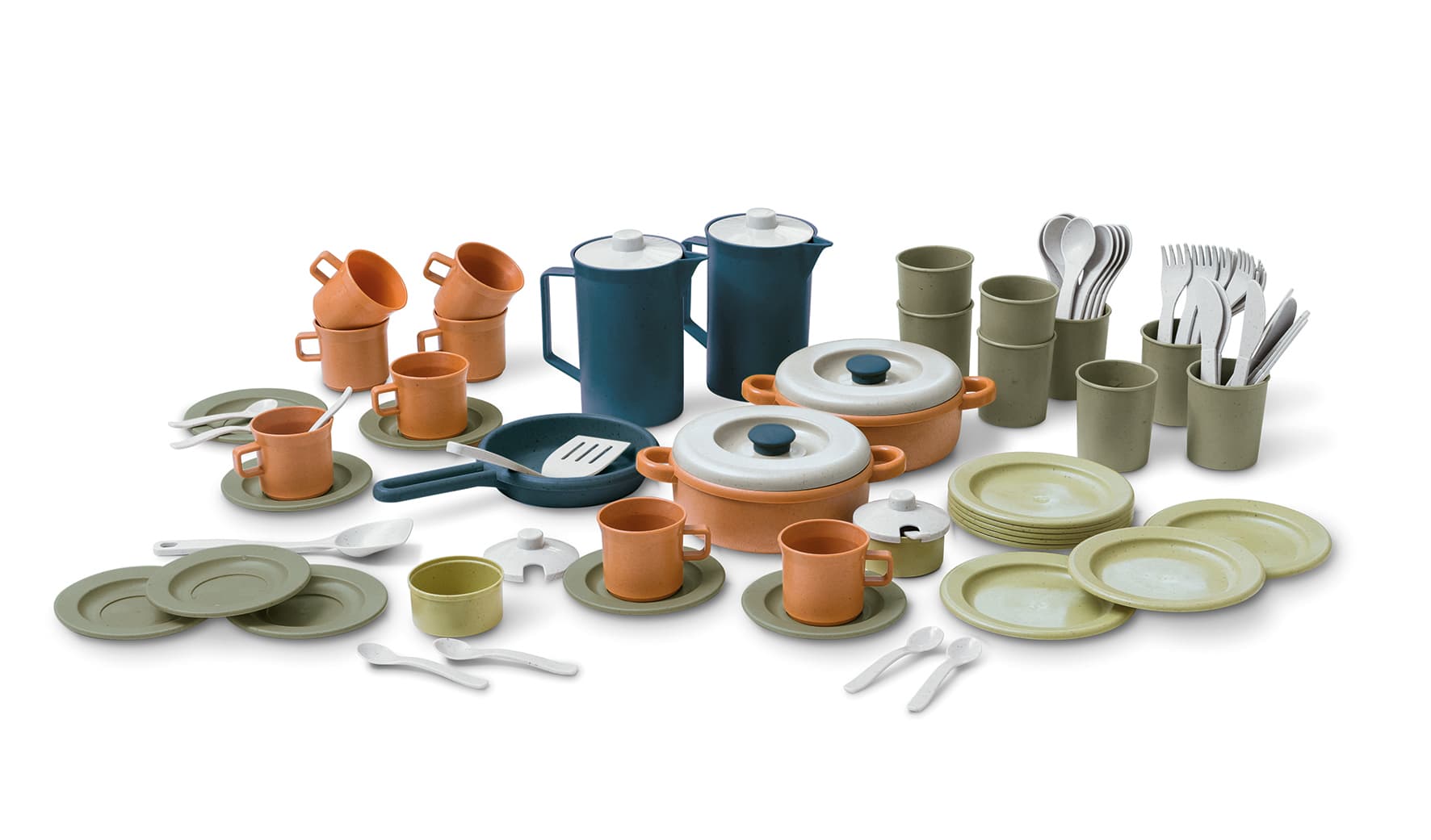 Veliki bio set posuđa od za igru uloga u vanjskom i unutarnjem prostoru. Proizvod je 100% za višekratnu upotrebu i od 100 % održivih sirovina. Set se sastoji od 79 dijelova s prekrasnim, pastelnim bojama. Može se prati u perilici suđa.