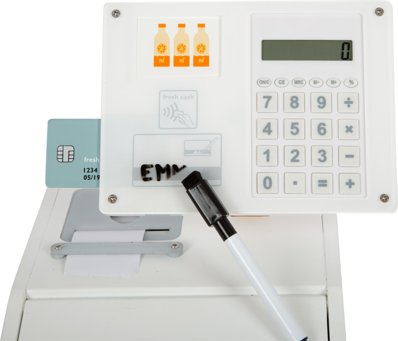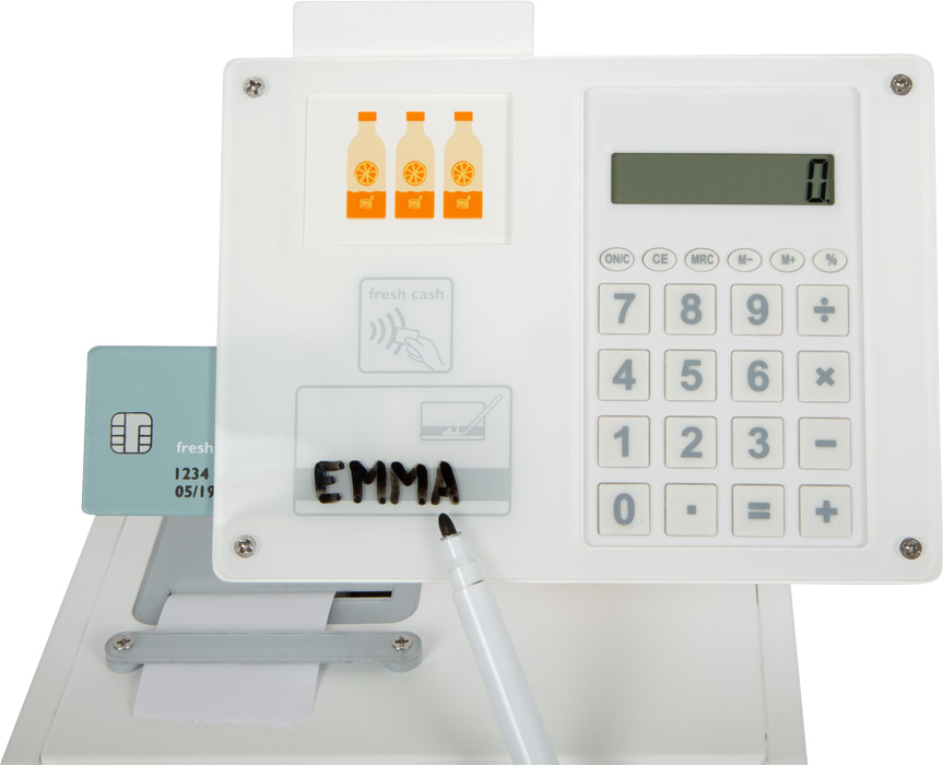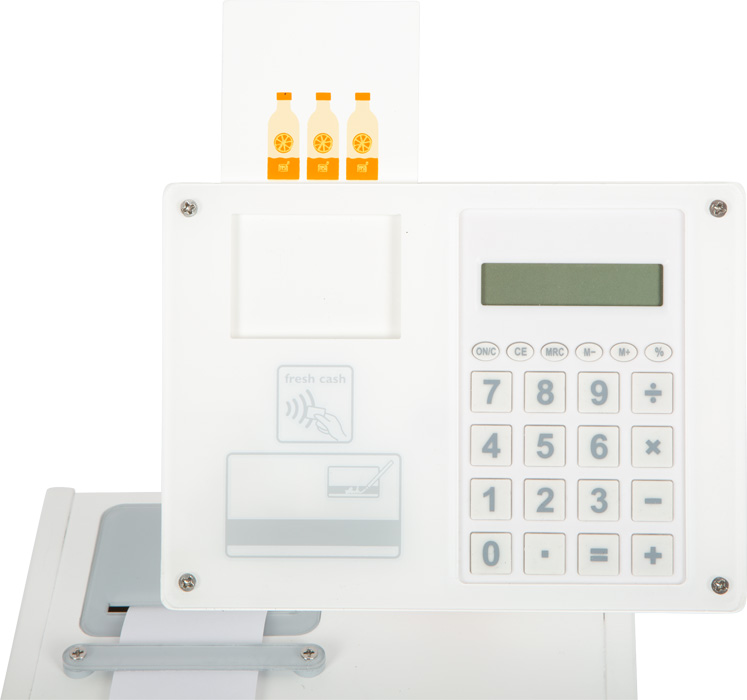 Igranjem “blagajne” s ovom blagajnom trenira se korištenje novca, iznosa i cijena, a 15 novčanica dizajnirano je tako da se mogu koristiti za vježbanje početničkih matematičkih zadataka. 5 dvostranih kartica s prehrambenim proizvodima također potiču djecu da nauče brojati i računati. Za one koji radije tipkaju ili kuckaju umjesto da računaju u glavi, cijene za kupljene proizvode mogu se unijeti u tipkovnicu pravog, integriranog kalkulatora. Visokokvalitetna izrada od robusnog drva i pleksiglasa čini ovu blagajnu za trgovinu igrama pravim privlačnim za oko u dječjoj sobi koja će zasigurno donijeti dugotrajnu zabavu.
