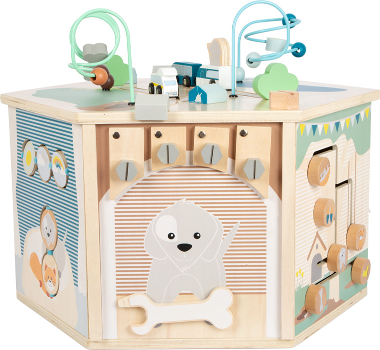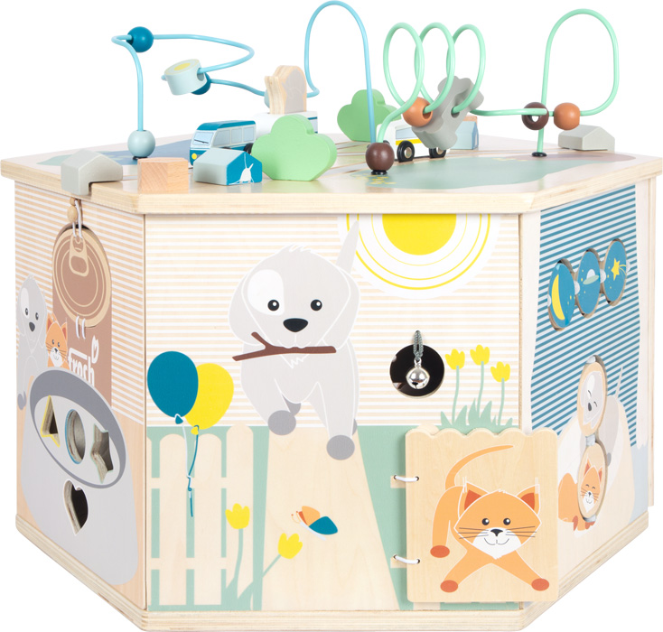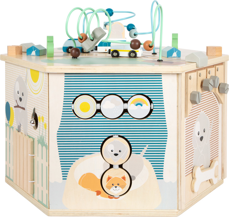 Ova kocka za aktivnosti s 8 strana nudi dugotrajnu zabavu u igri i prenosi znanje o tome kakav je život s kućnim ljubimcima! Djeca će svoje motoričke sposobnosti uvježbavati na kliznom labirintu, igri slaganja oblika, igri vrtećih pločica i igri odvojivih niti/razvrstavanja po bojama – sve uz vizualnu temu svakodnevnog života s kućnim ljubimcima! Igra konstrukcije s vijcima i alatima potiče razvoj spretnosti, a zasun za zvono/ograde daje akustičnu stimulaciju. Vrhunac je okretni poklopac s pločom koja se može montirati bez alata koja prikazuje zabavno kampiranje na poleđini s labirintima od perlica i željezničkim tračnicama. Savjet: poklopac se može koristiti i kao površina za slikanje ili igru na podu.