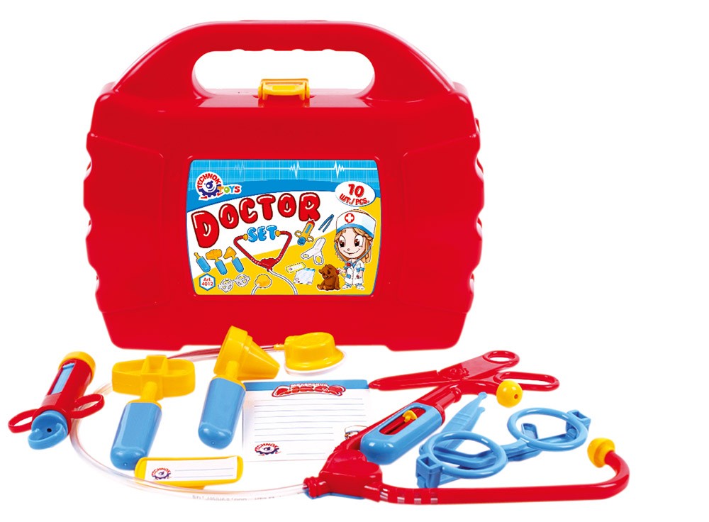 Prekrasan doktorski kofer s igračkama za igranje uloga mladih liječnika. Kofer sadrži mnoge dodatke uključujući pločicu za ime liječnika.