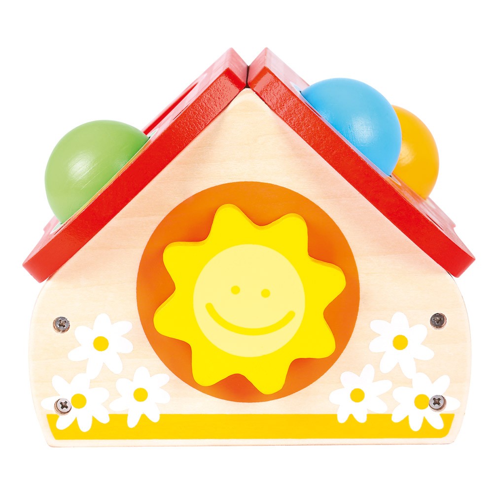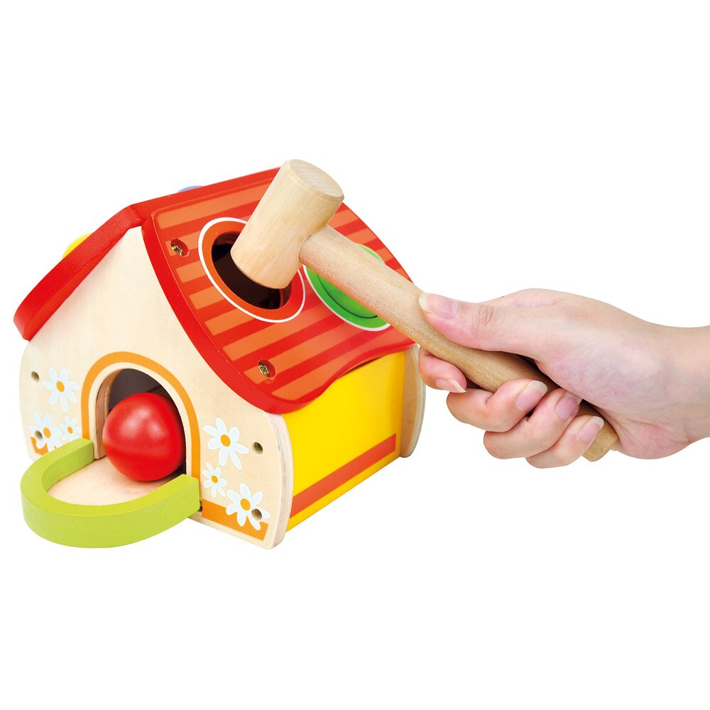 Drvena kućica s čekićem i kuglicama zabavna je igračka za malu djecu. Kucanje i udaranje u kućicu potiče grubu motoriku i koordinaciju djeteta. Paket uključuje kućicu, čekić i četiri lopte.