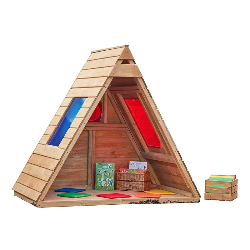 Drvena kućica s velikim prozorima i otvorenim dizajnom. Može biti tajno skrovište, prostor za istraživanje ili maleni šumski vidikovac.