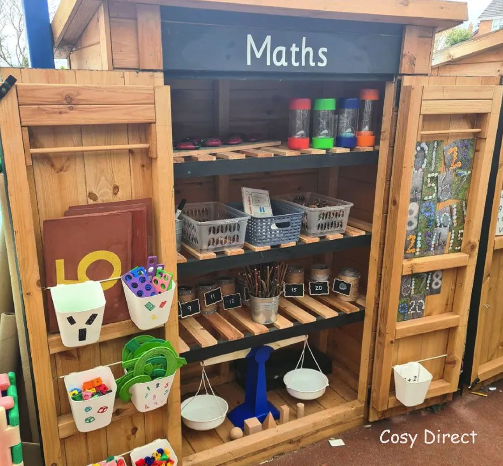 Na vratima drvene kućice omogućeno je i pisanje kredom za spontano vježbanje brojeva, kreativno crtanje ili ostavljanje poruka djeci. Idealno za sigurnosnu pohranu matematičkih resursa.