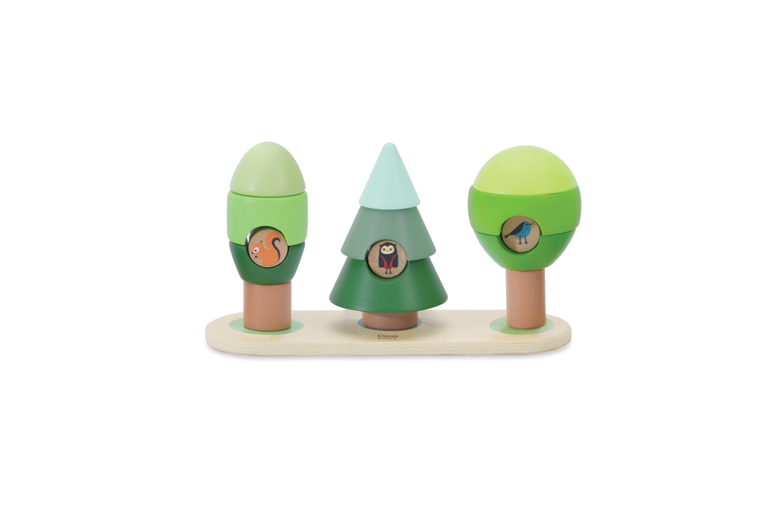Tri slatka drveta i životinje koje žive na njima: sova, djetlić i vjeverica. Slagalice se mogu umetati na podlozi sa štapom ili na ravnoj površini. Potiče razvoj fine motorike, logičkog razmišljanja i vizualne percepcije.