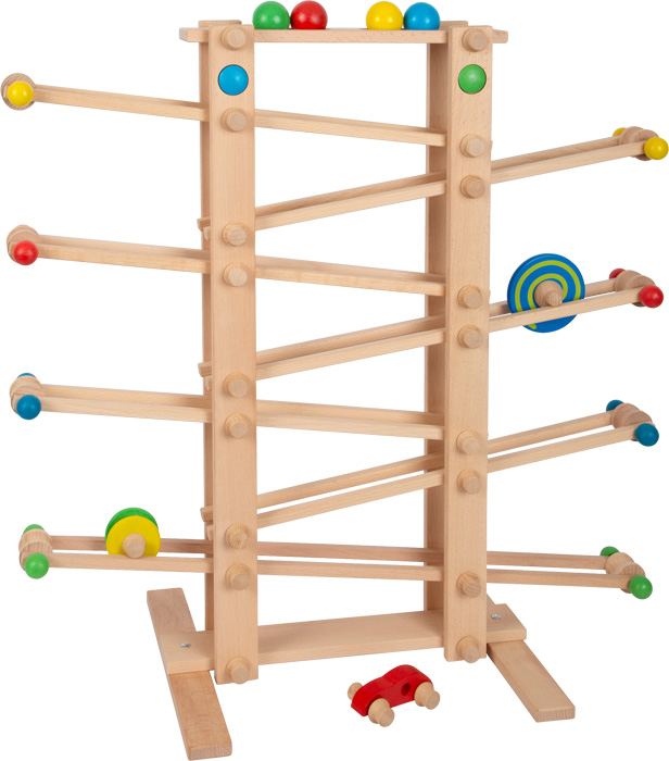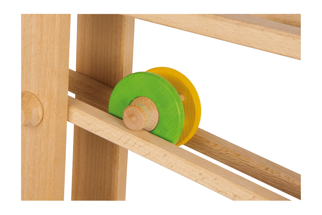 Izrađena od fino obrađenog punog drva, ova velika staza od mramora donosi kretanje u zabavu. Loptice jarkih boja, automobil, disk koji se okreće i bačva sa zvonom unutra kotrljaju se niz staze uz puno zvonjave i zveckanja.