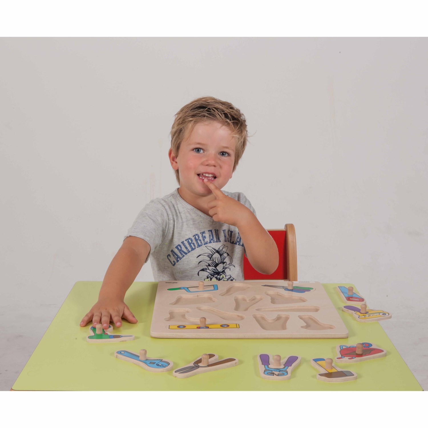Drvena umetaljka na ploči od dvanaest različitih drvenih oblika alata za umetanje. Dijete se upoznaje s različitim priborom alata čime širi svoje spoznaje.