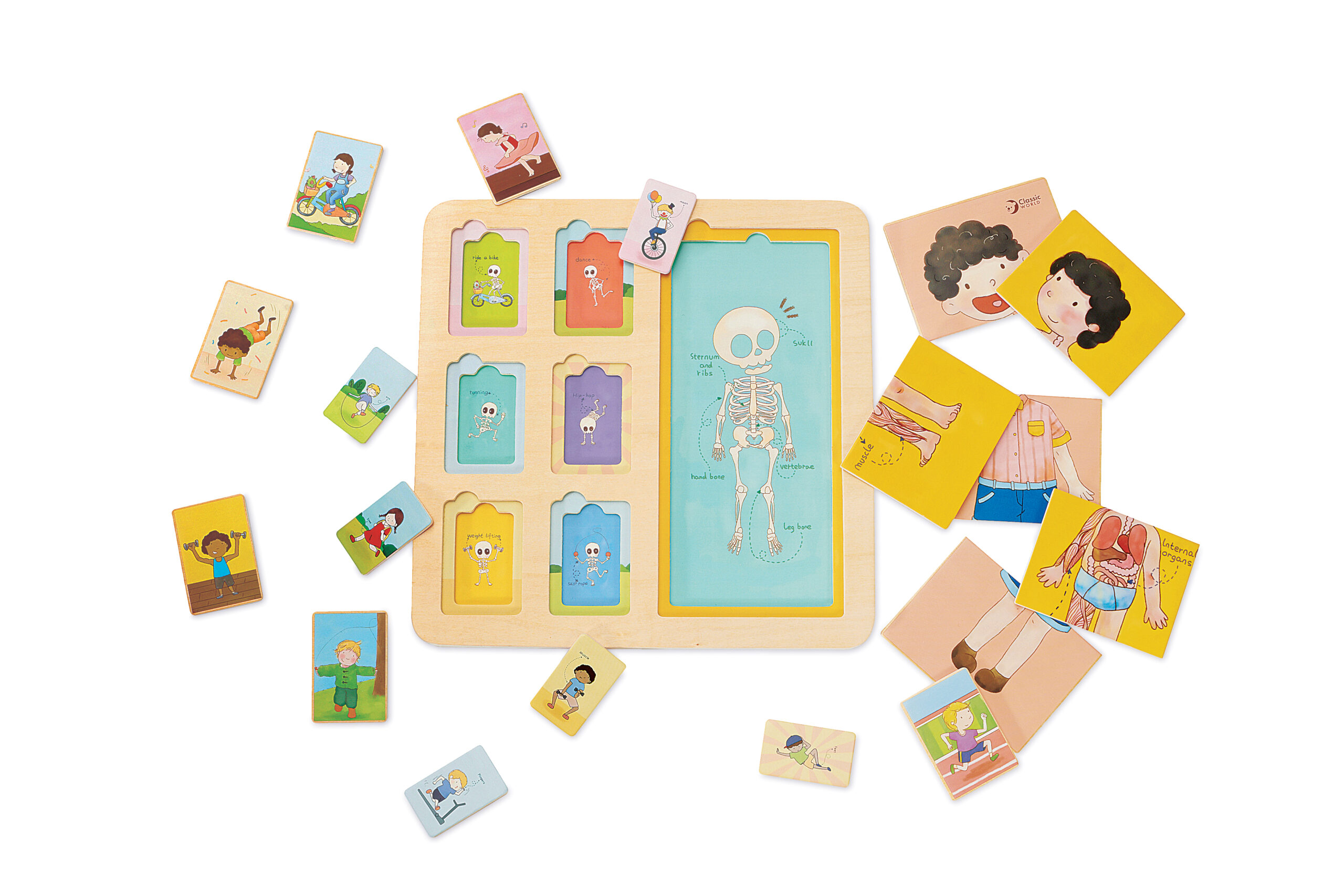 Drvene slagalice sastoje se od tri sloja, odnosno razine kako bi se djecu pomoglo u otkrivanju ljudske anatomije. Svaka razina predstavlja drugačiji dio anatomije čovjeka. Pokazuje koštani i mišićni sustav s unutarnjim organima. Odličnog je sadržaja za upoznavanje djece sa vlastitom anatomijom tijela, potiče razvoj okulomotorne koordinacije, logičkog razmišljanja te fine motorike.