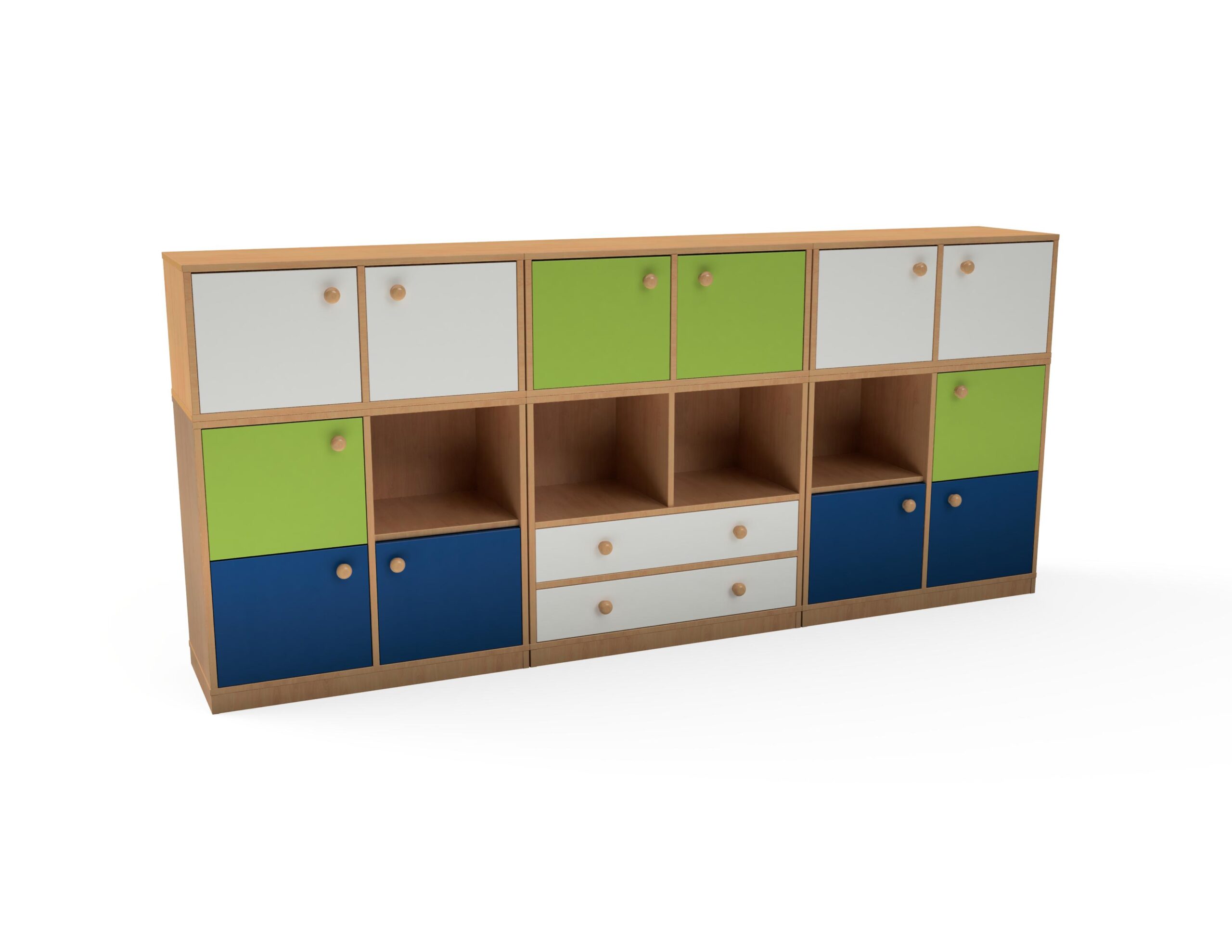 Praktična garnitura za spremanje dokumentacije ili pak društvenih igara. Na ormar uključena bijela, plava i zelena vrata i bijele ladice. Bukova ručkica lakirana visokokvalitetnim bezbojnim lakom na bazi vode, koja se spaja bez vidljivog spoja na vrata te tako daje dugotrajnost u korištenju.  Izrađeno od oplemenjenog iverala bukva, zelena, plava i bijela u debljini od 18 mm te rubna traka ABS 2 mm: cool, zelena, plava i bijela. Spajan je bez vidljivih spojeva.