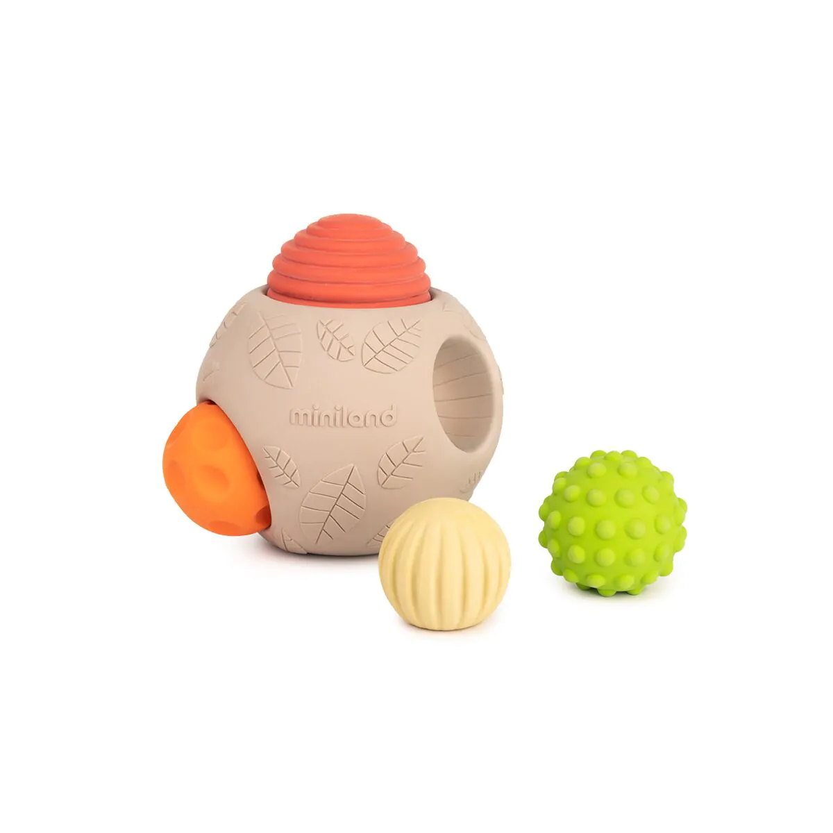 Set od 5 senzornih loptica od prirodne gume potiče taktilnu i vizualnu stimulaciju, a također doprinosi razvoju motoričkih sposobnosti djece. Zahvaljujući mekom materijalu, djeci su vrlo jednostavne za rukovanje. Dizajnirane u upečatljivim bojama i različitim teksturama. Manje loptice stanu u veću, što omogućuje i razvoj okulomotorne koordinacije.