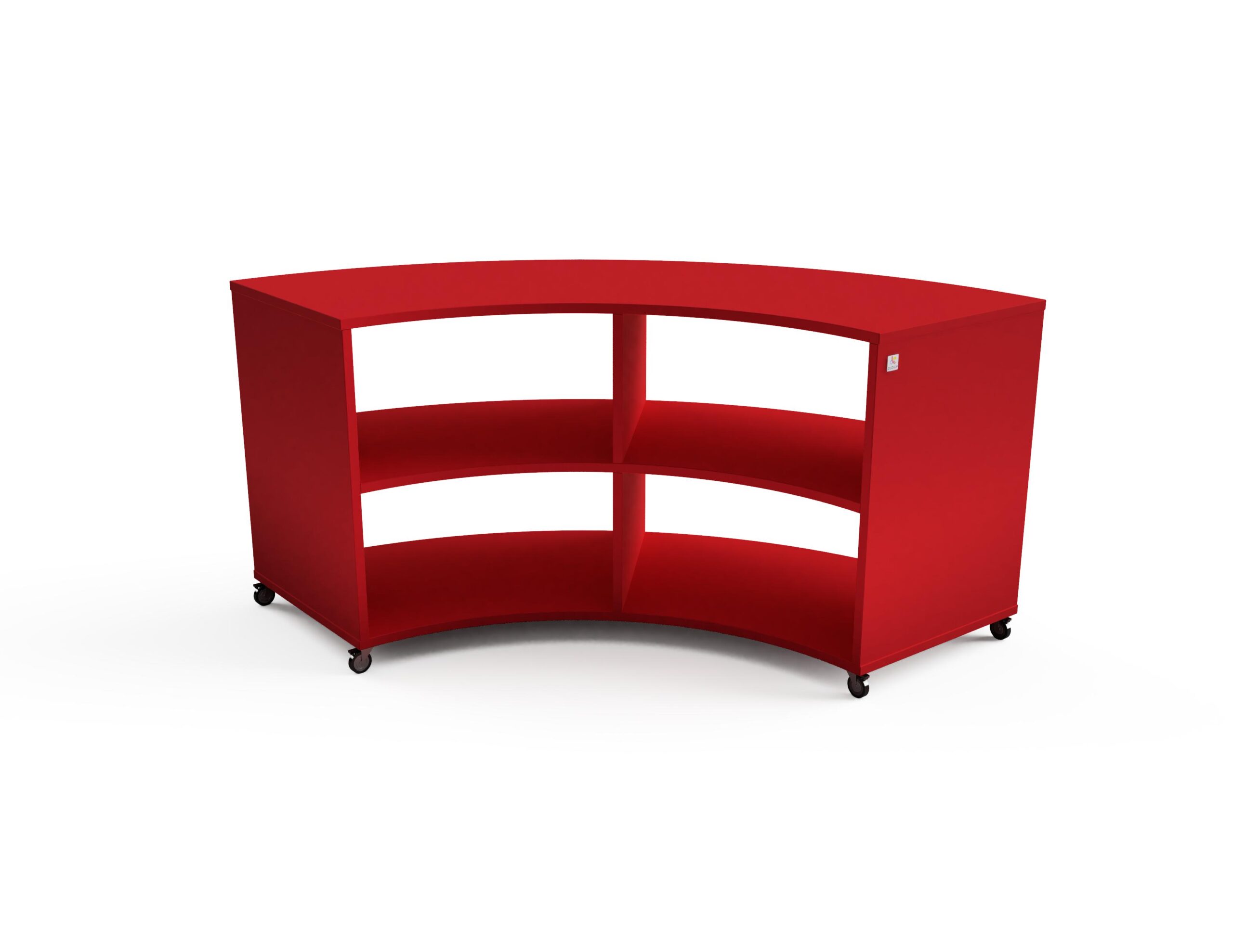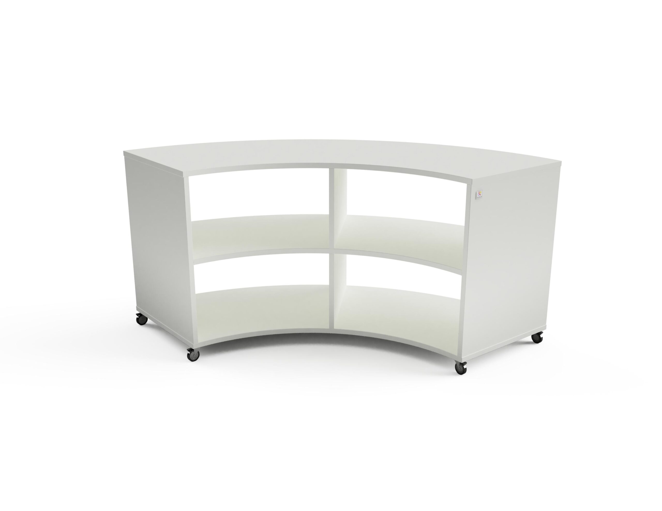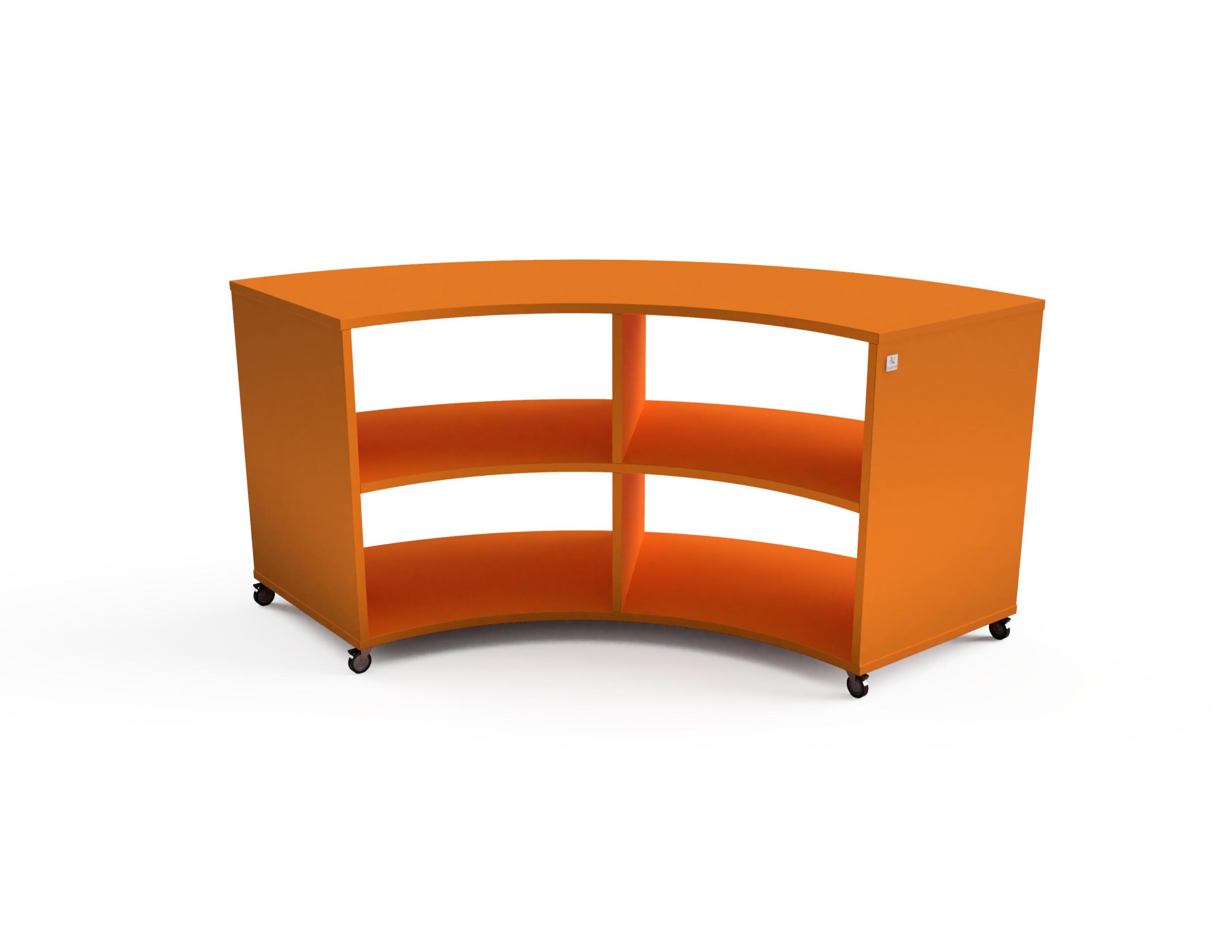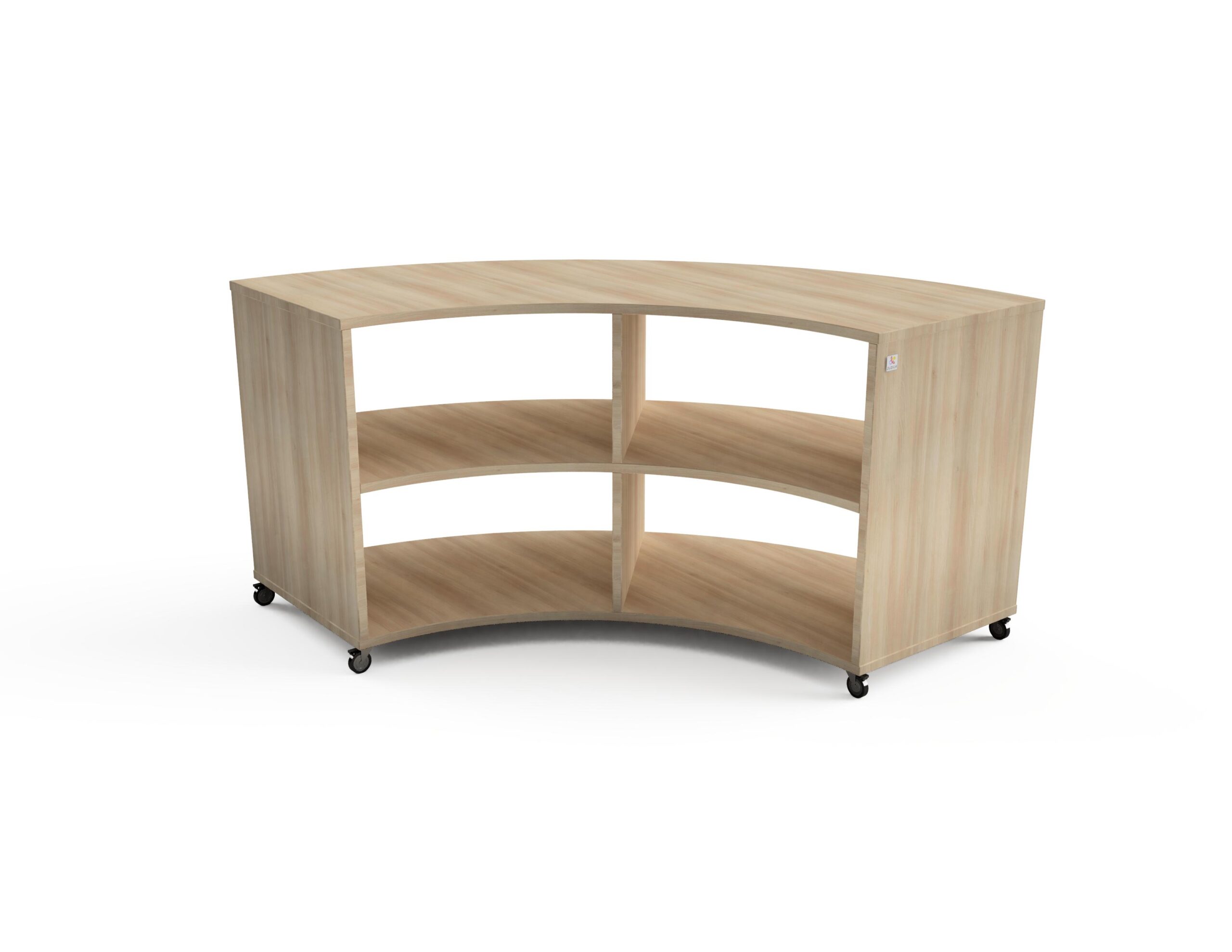 Element četvrtina kruga sastoji se od dvije police. Idealan za pregrađivanje prostora samostalno ili kao dio seta. Lijepo se kombinira s ostalom kolekcijom namještaja. Izrađen od materijala po izboru u debljini od 18 mm. Spajan je bez vidljivih spojeva. Ormarić s podnožjem na metalnim kotačičima.