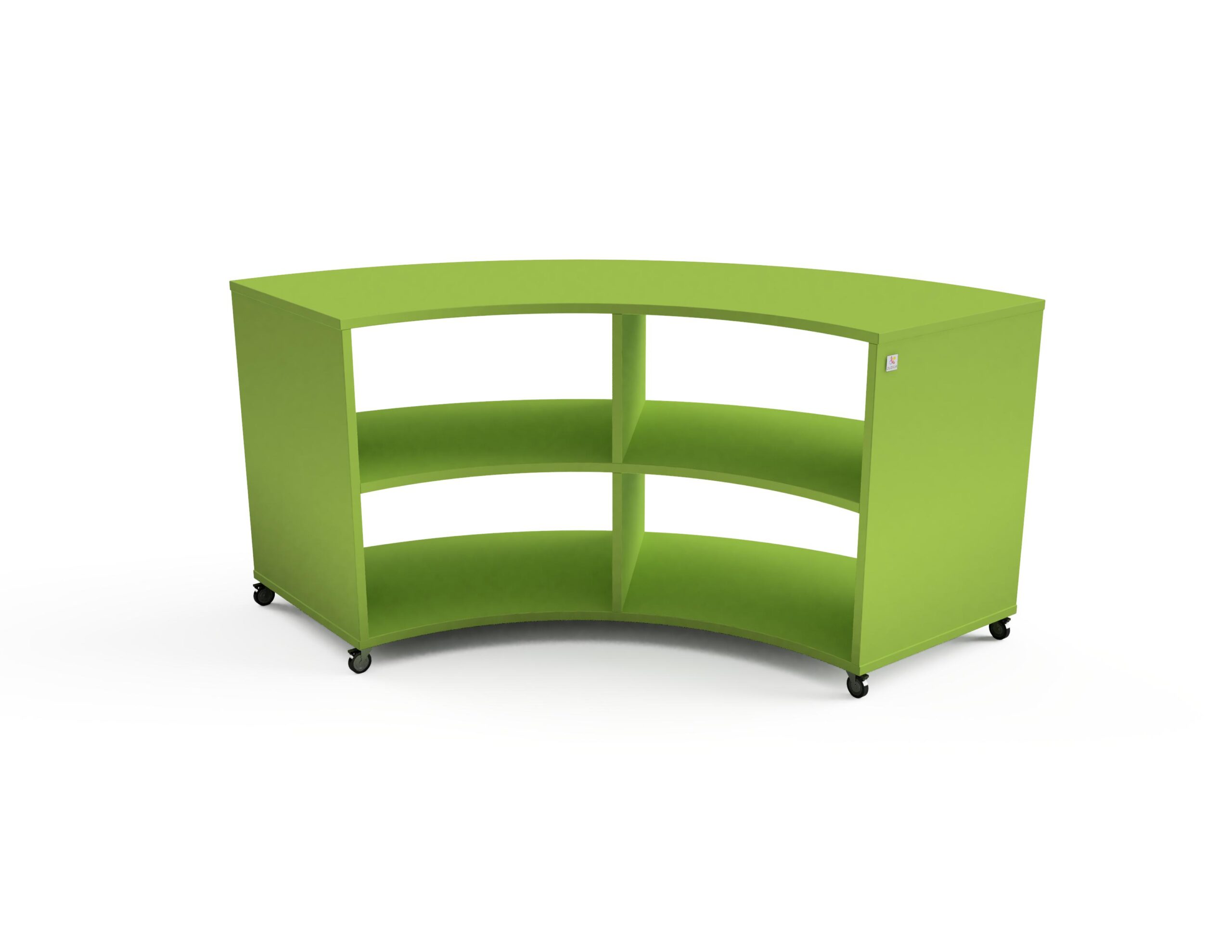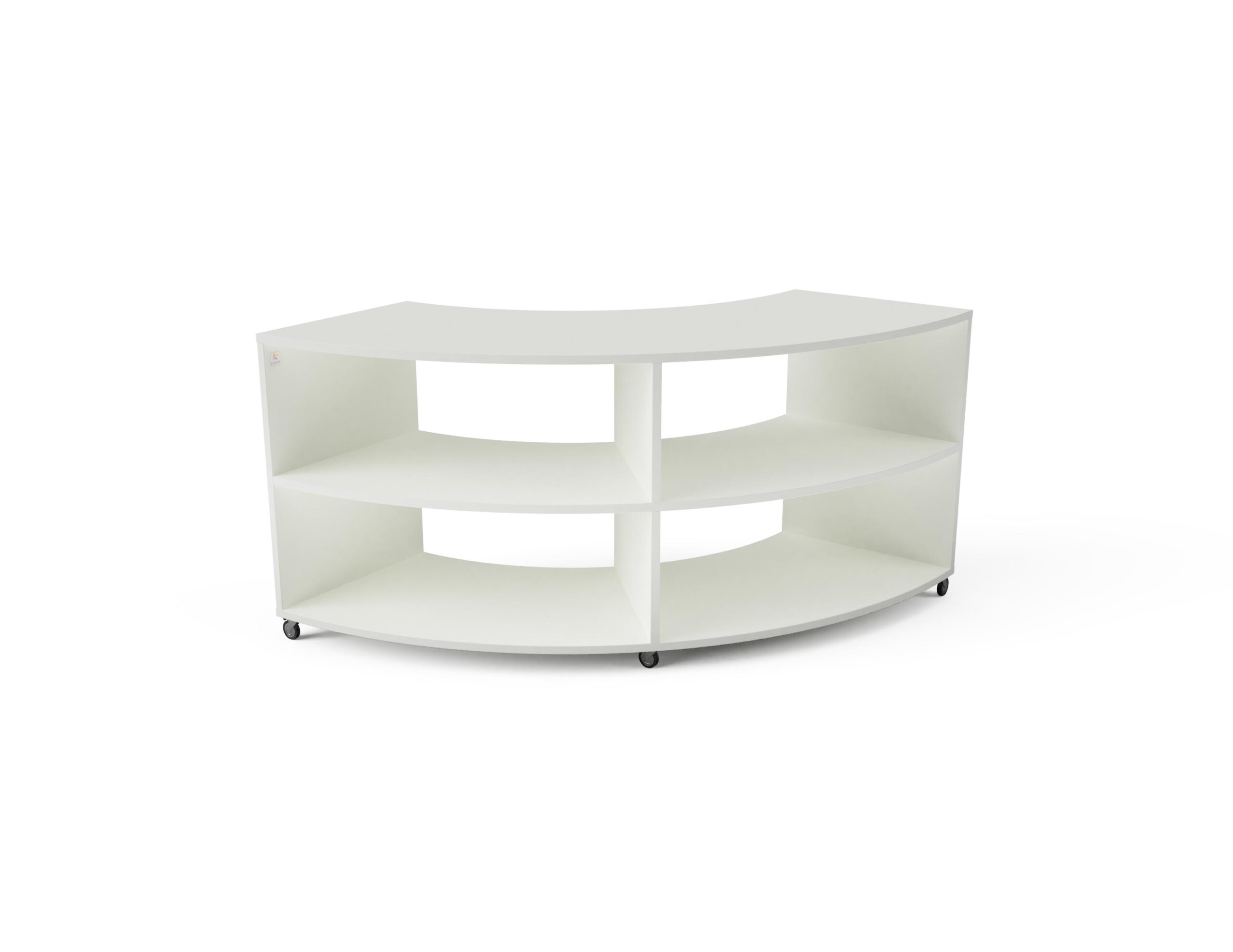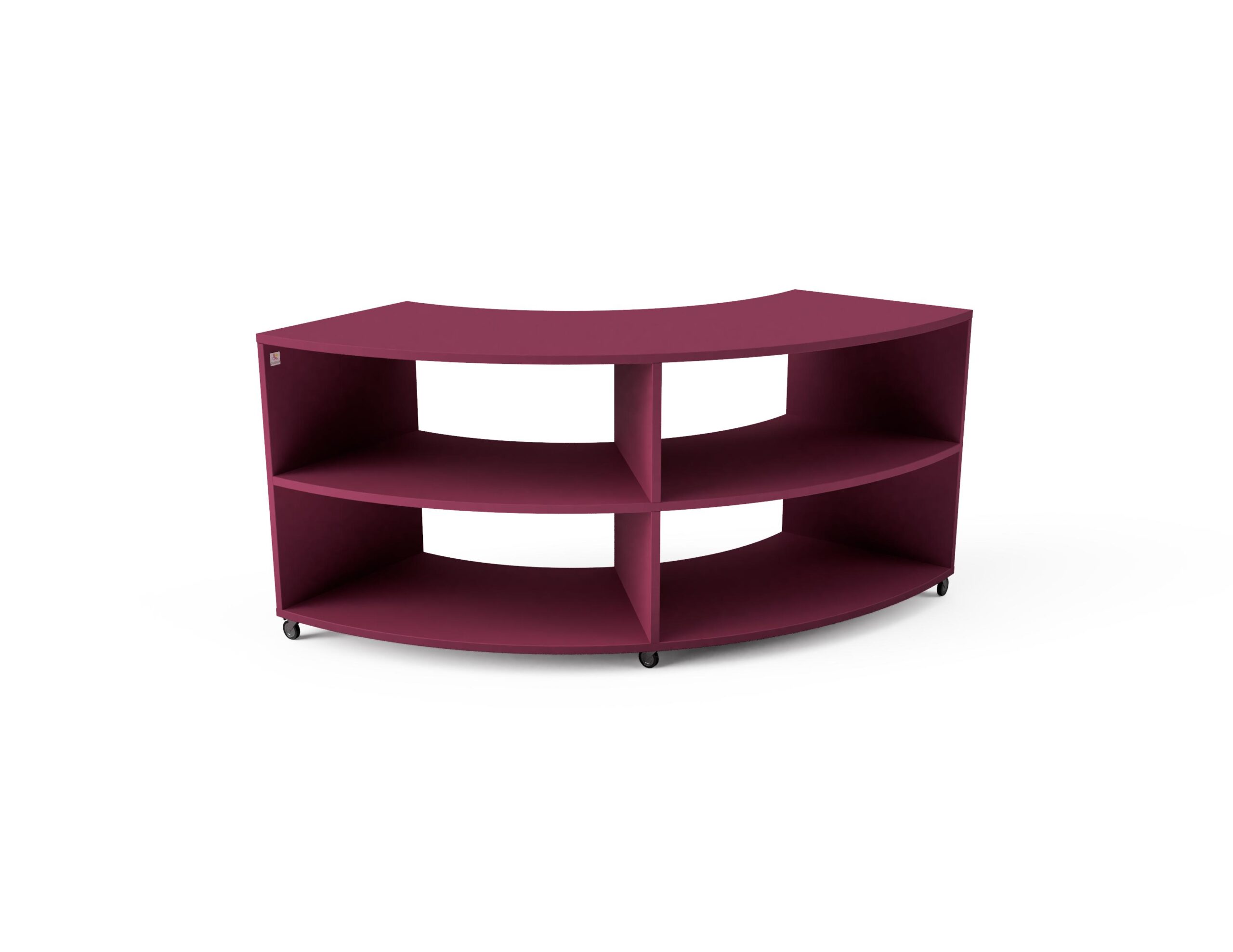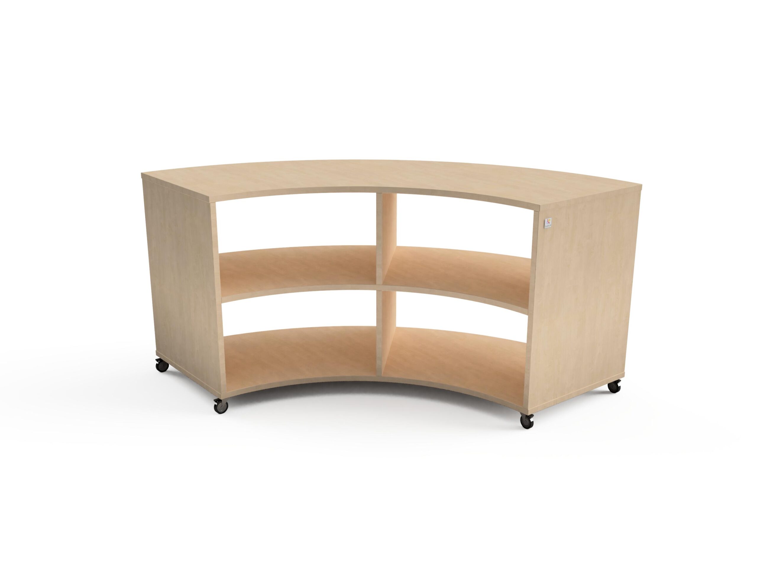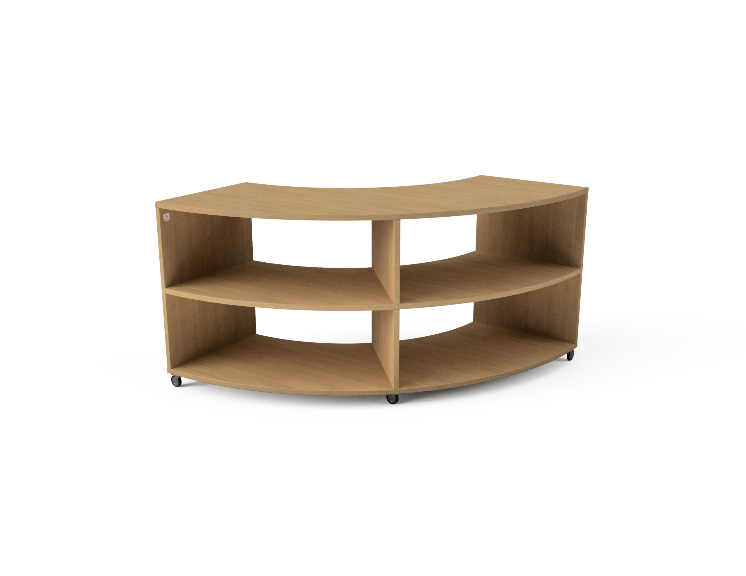 Element četvrtina kruga sastoji se od dvije police. Idealan za pregrađivanje prostora samostalno ili kao dio seta. Lijepo se kombinira s ostalom kolekcijom namještaja. Izrađen od materijala po izboru u debljini od 18 mm. Spajan je bez vidljivih spojeva. Ormarić s podnožjem na metalnim kotačičima.