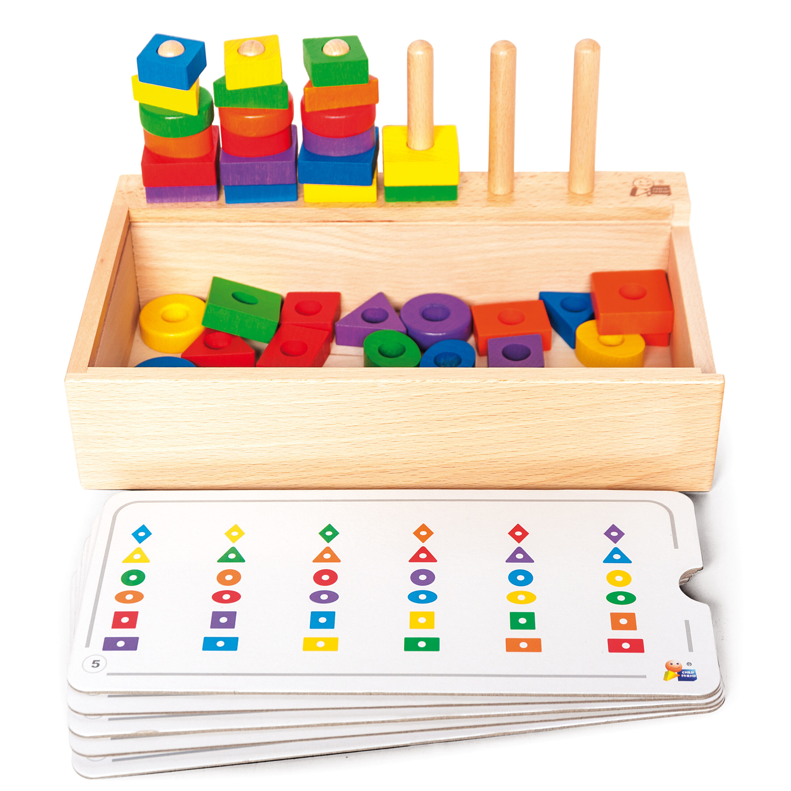 Zabavan način učenja oblika, boja i uzoraka s 2D predloškom i 3D oblicima. Igra služi motoričkim vježbama, razvoju koncentracije i koordinacije pokreta djece od 3 godine. Djeca nasumice ili prema zadatcima s predlošcima nižu elemente na stalak.