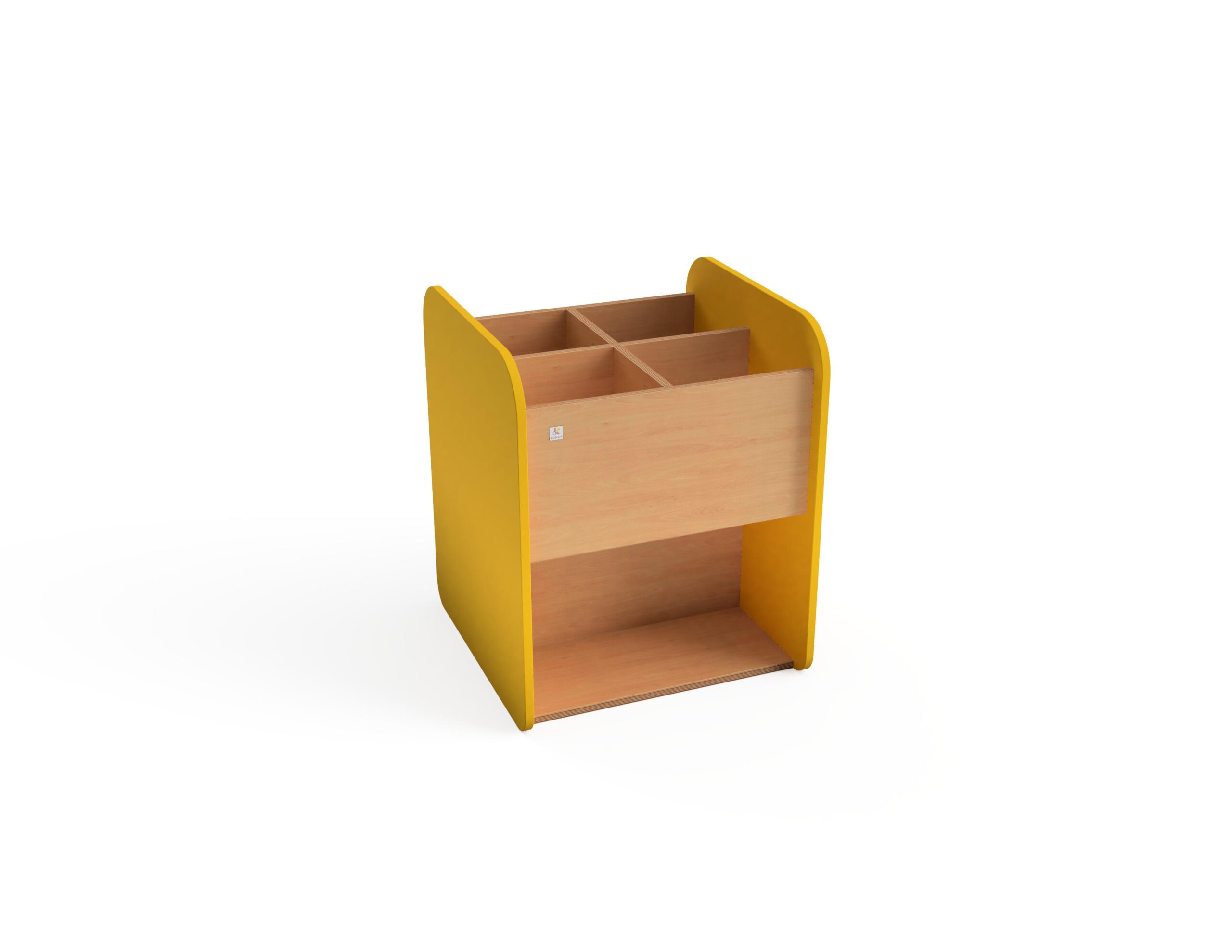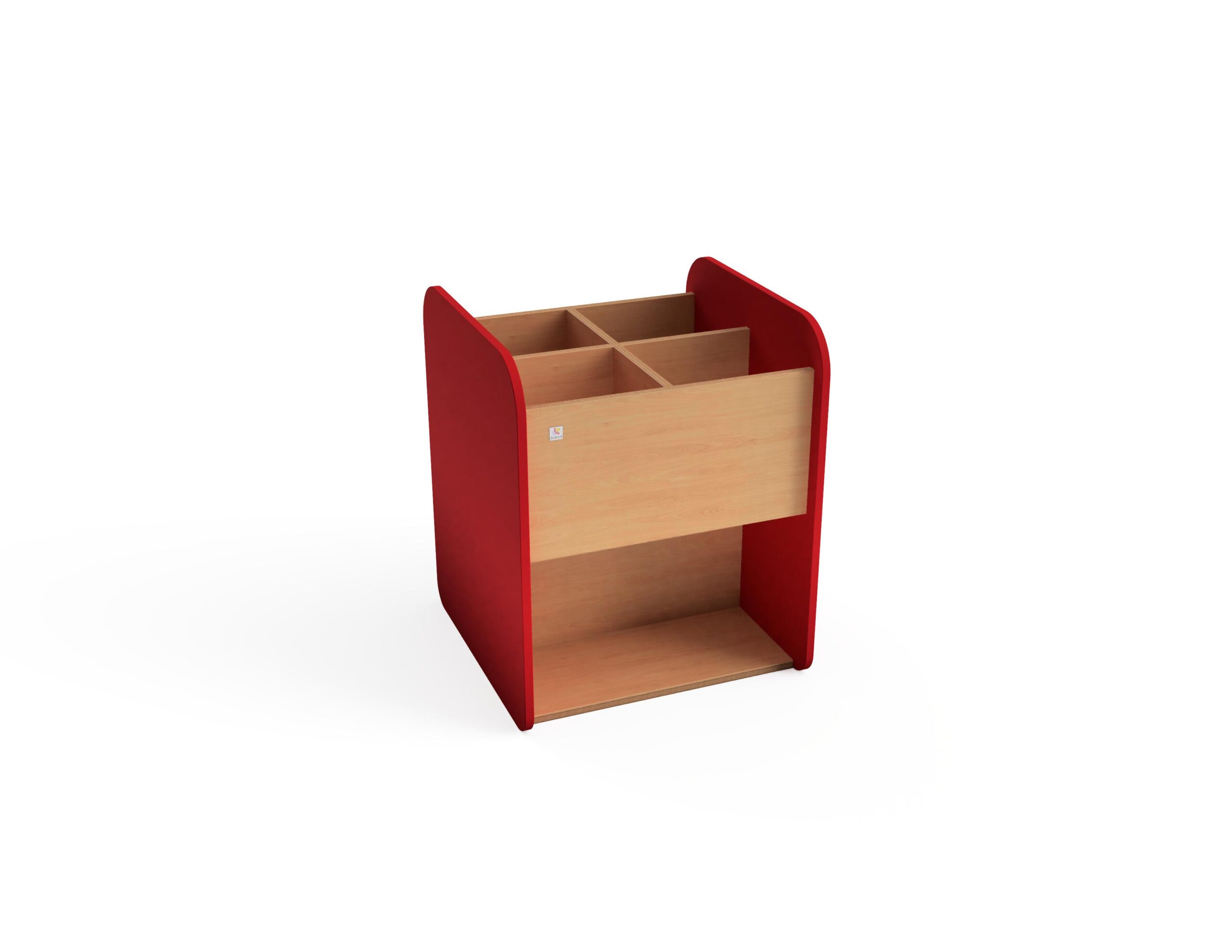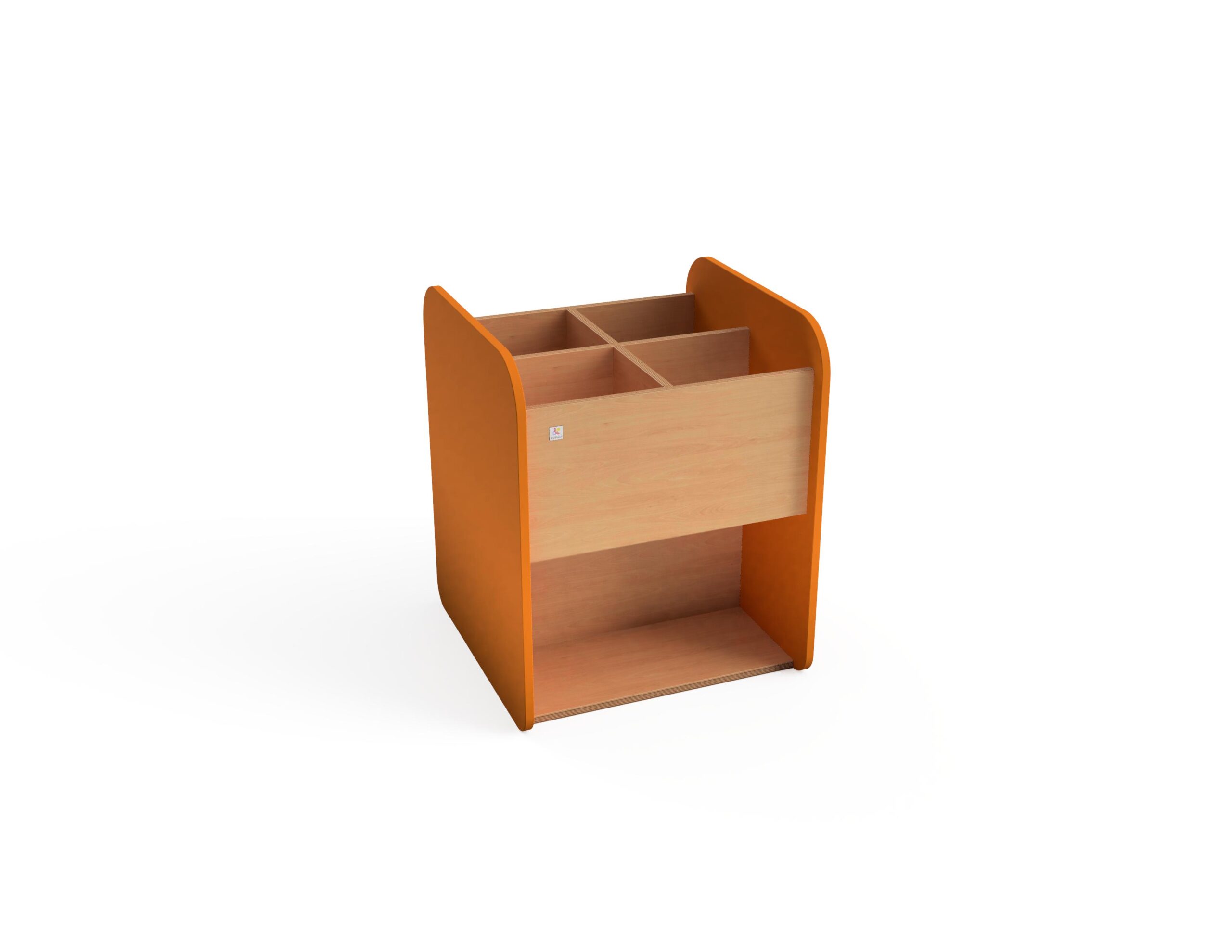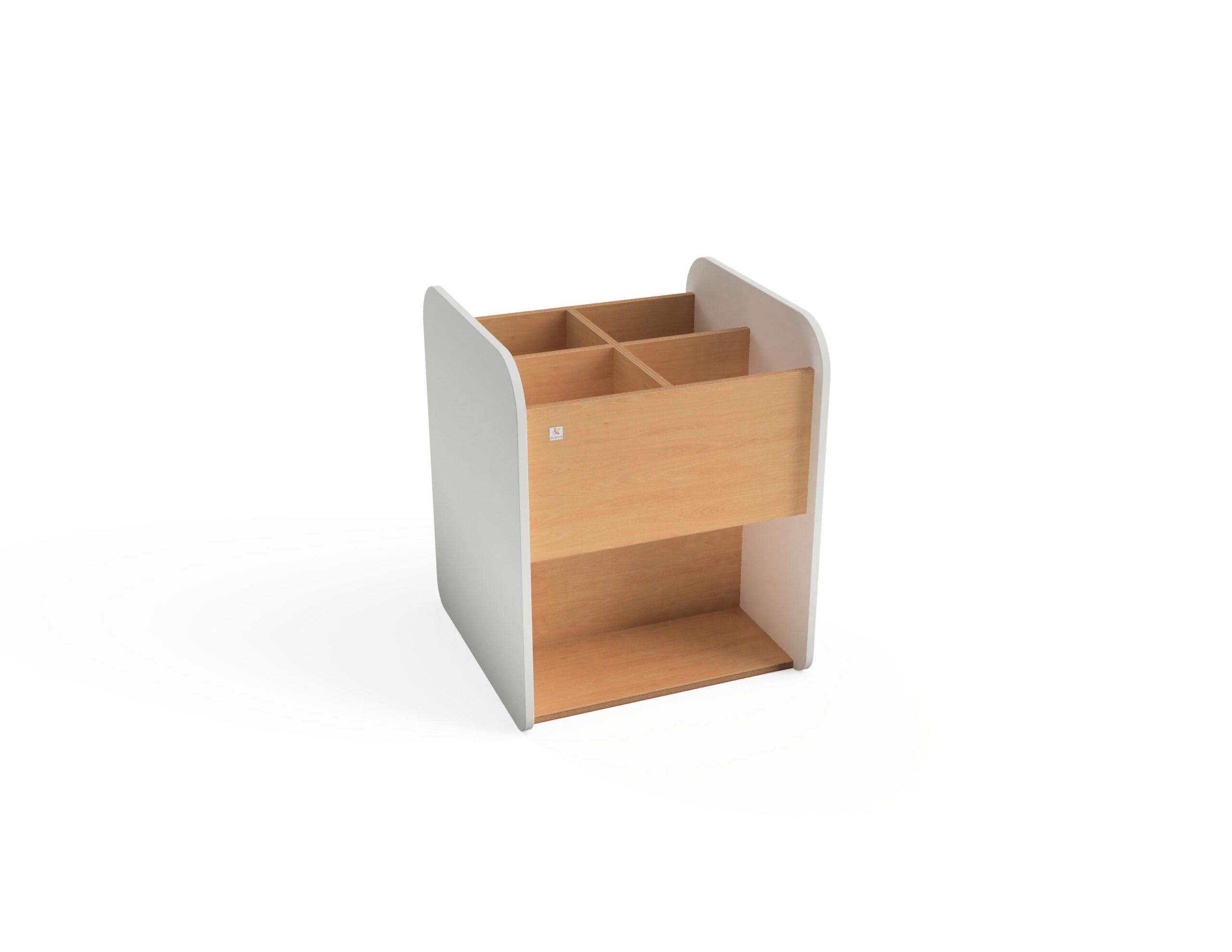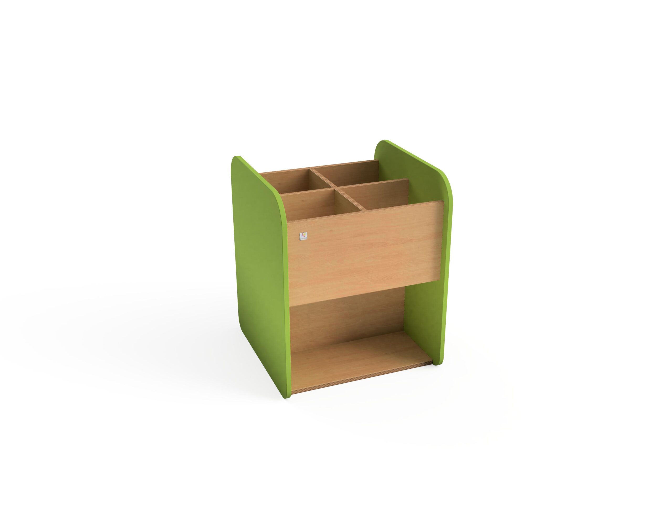 Element za slikovnice, bočne stranice u boji. Sastoji se od 6 pretinaca za knjige. Izrađen od materijala po izboru u debljini od 18 mm. Spajan je bez vidljivih spojeva. Ormarić s podnožjem na izbor: bez podnožja, drvena sokla, metalni kotači i metalne nogice.