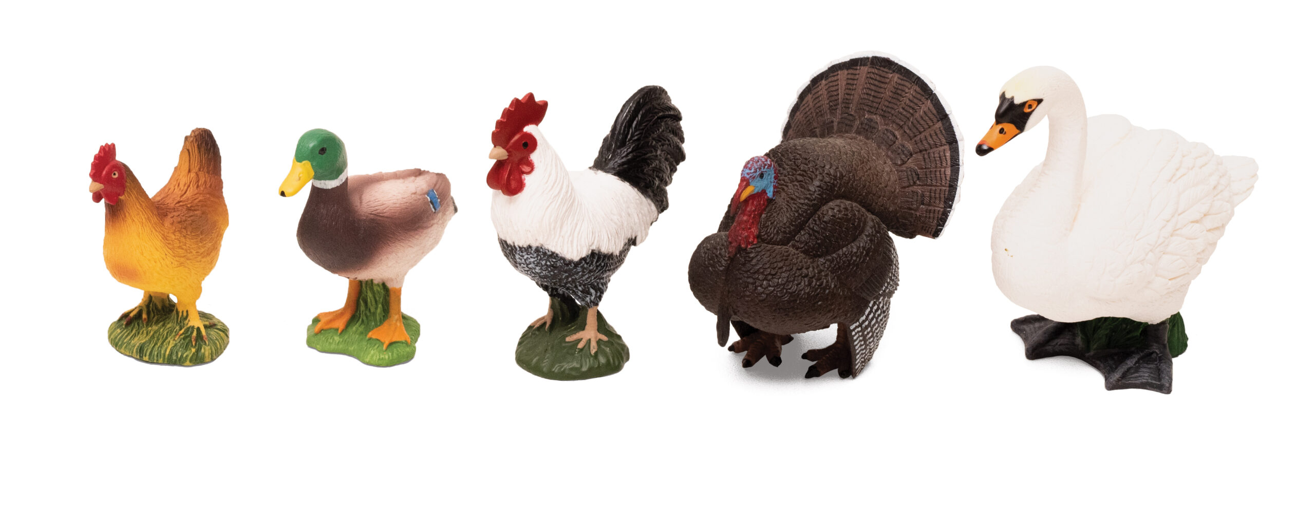 Set od pet figurica koje predstavljaju ptice na selu/farmi. Djeca stvaraju vlastitu farmu životinja, uče se glasati poput njih, imenovati i prepoznavati ih. Stvaraju svoju prvu malu kolekciju figurica.