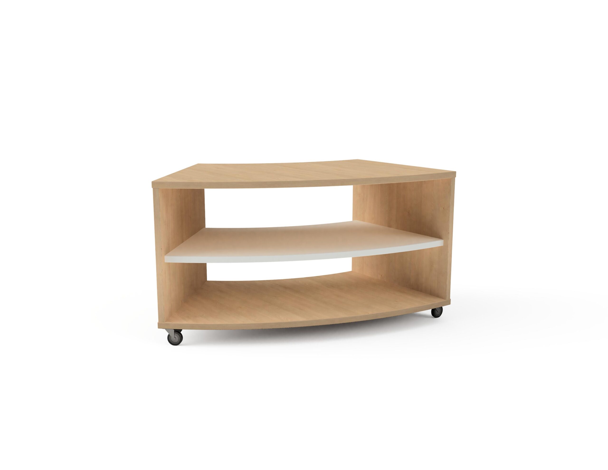 Zaobljeni ormar sastoji se od 2 otvorene zaobljene police. Idealan za pregrađivanje prostora samostalno ili kao dio seta. Izrađen od materijala po izboru u debljini od 18 mm. Spajan je bez vidljivih spojeva. Ormarić s podnožjem na izbor: drvena sokla, metalni kotači i metalne nogice.