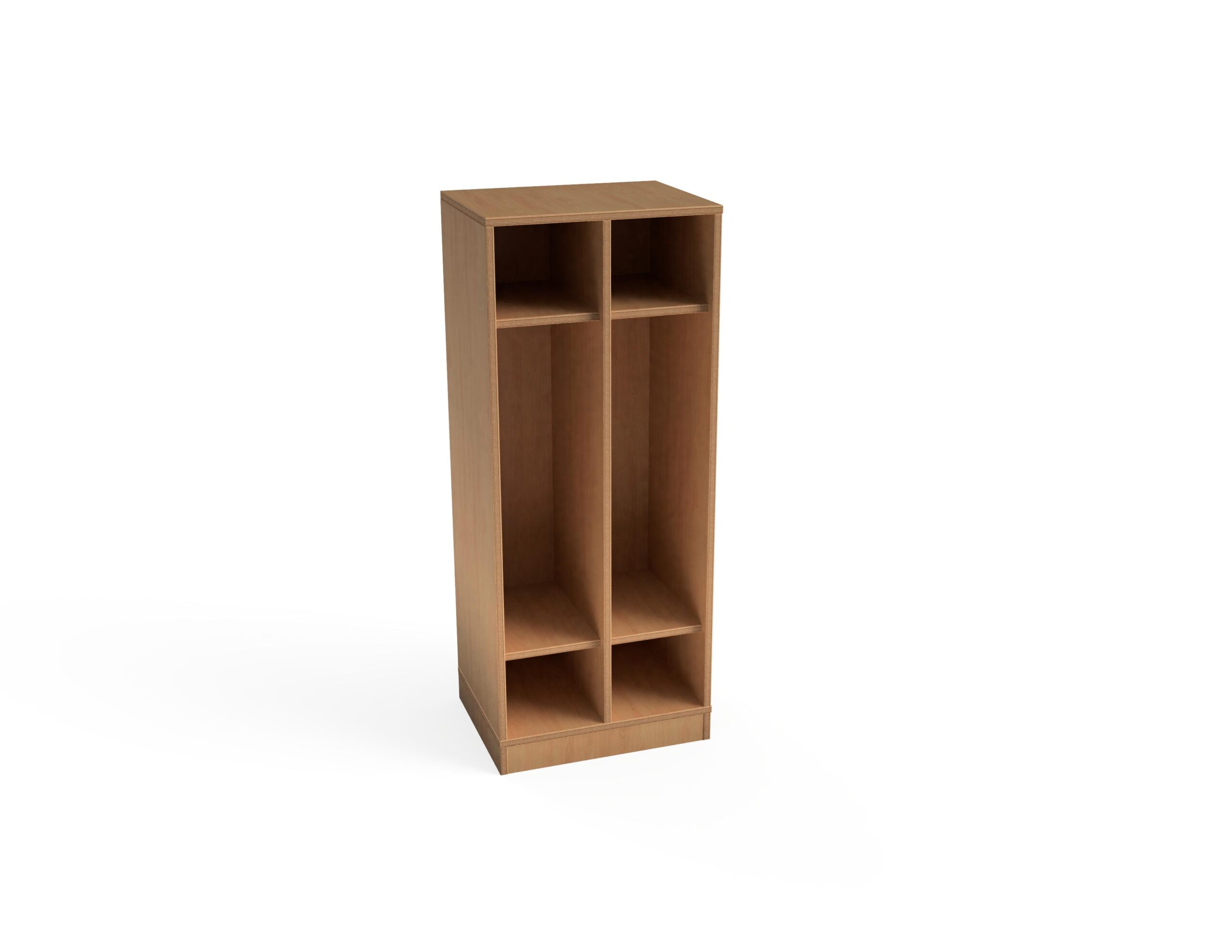 Garderoba iz kolekcije Ani, otvorena, za dvoje djece. Praktična za sve prostore. Sadrži 2 ormarića, svaki s policom i  vješalicom za vješanje odjeće. Izrađen od materijala po izboru u debljini od 18 mm. Stražnja strana izrađena od istog materijala. Spajan je bez vidljivih spojeva. Garderoba s podnožjem na izbor: drvena sokla, metalni kotači i metalne nogice. Na garderobu se mogu ugraditi  vrata iz Dudica MDF kolekcije.