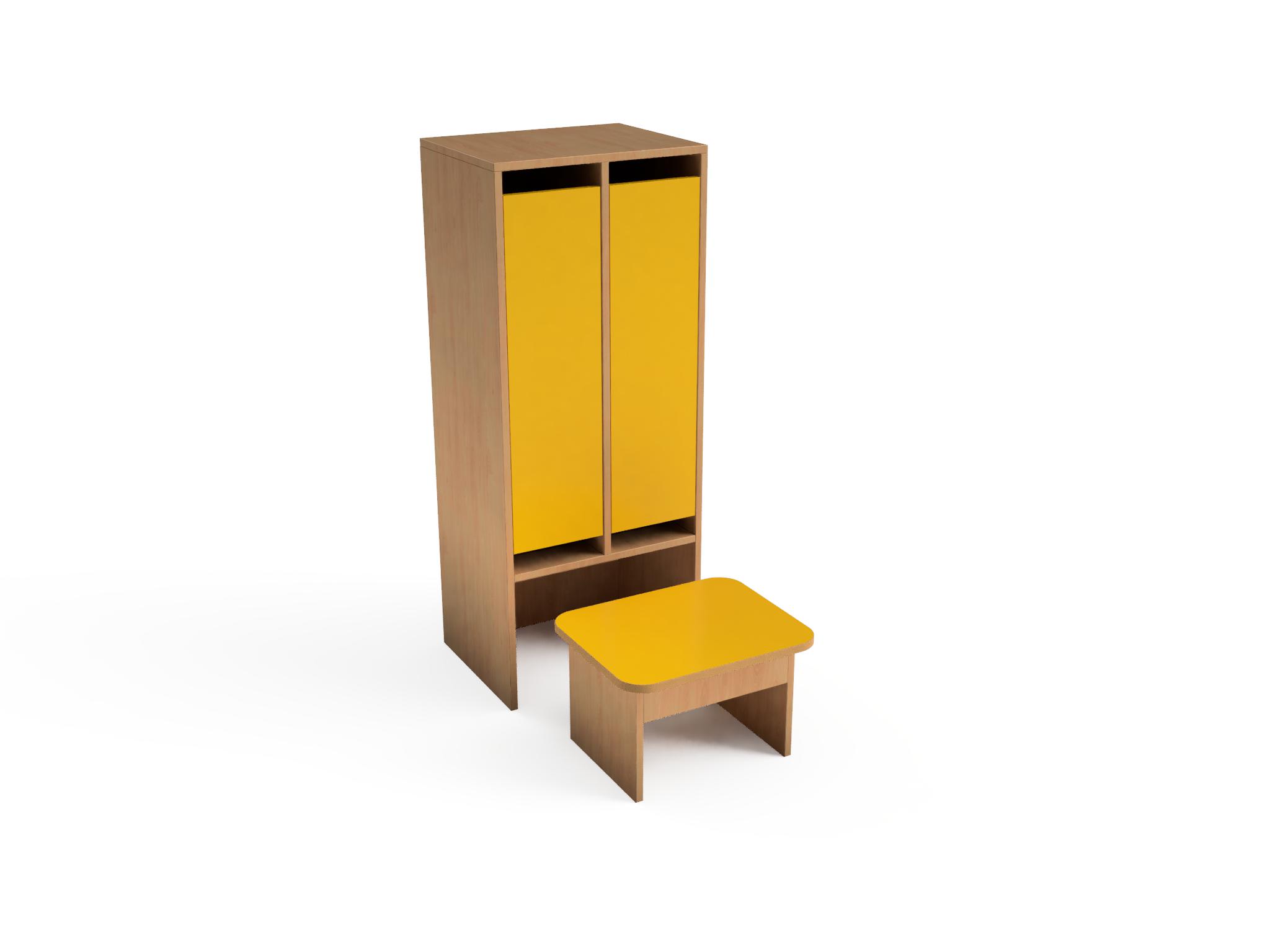 Garderoba iz kolekcije Lolo+, zatvorena, za dvoje djece. Praktična za sve prostore. Sadrži 2 ormarića, svaki s policom, vješalicom za vješanje odjeće te klupicom na izvlačenje. Izrađen od materijala po izboru u debljini od 18 mm. Stražnja strana izrađena od istog materijala. Spajan je bez vidljivih spojeva. Fronte vrata i sjedišta mogu biti izrađene u boji po izboru iz palete boja koje nudimo. Na garderobu moguće ugraditi ručkice lakirana visokokvalitetnim bezbojnim lakom na bazi vode, koja se spaja bez vidljivog spoja na vrata te tako daje dugotrajnost u korištenju. Sva vrata mogu se urediti aplikacijom po izboru.