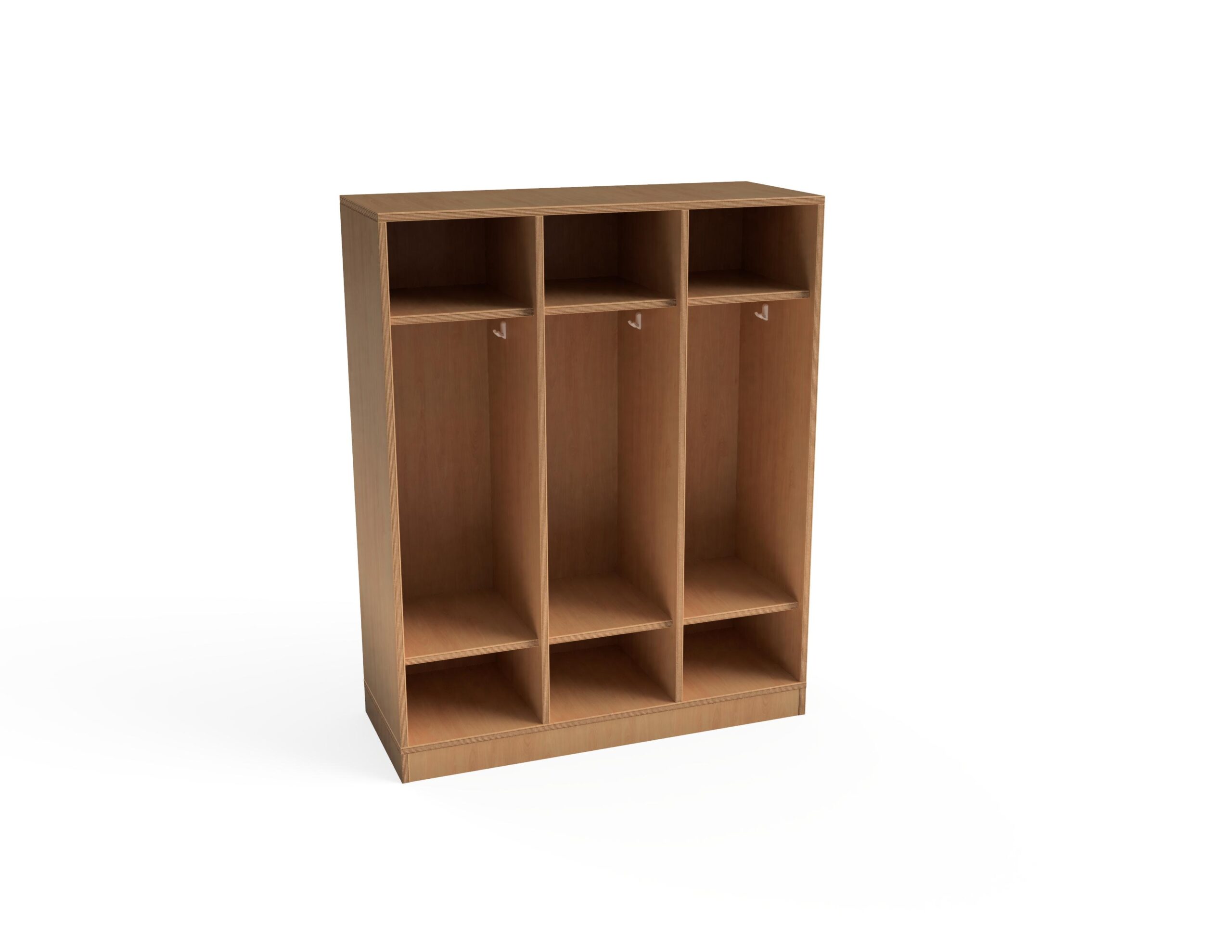 Garderoba iz kolekcije Mari, otvorena, za šestero djece. Praktična za sve prostore. Sadrži 3 ormarića, svaki s dvije police i dvije vješalice za vješanje odjeće. Izrađen od materijala po izboru u debljini od 18 mm. Stražnja strana izrađena od istog materijala. Spajan je bez vidljivih spojeva. Garderoba s podnožjem na izbor: drvena sokla, metalni kotači i metalne nogice. Na garderobu se mogu ugraditi  vrata iz Dudica MDF kolekcije.