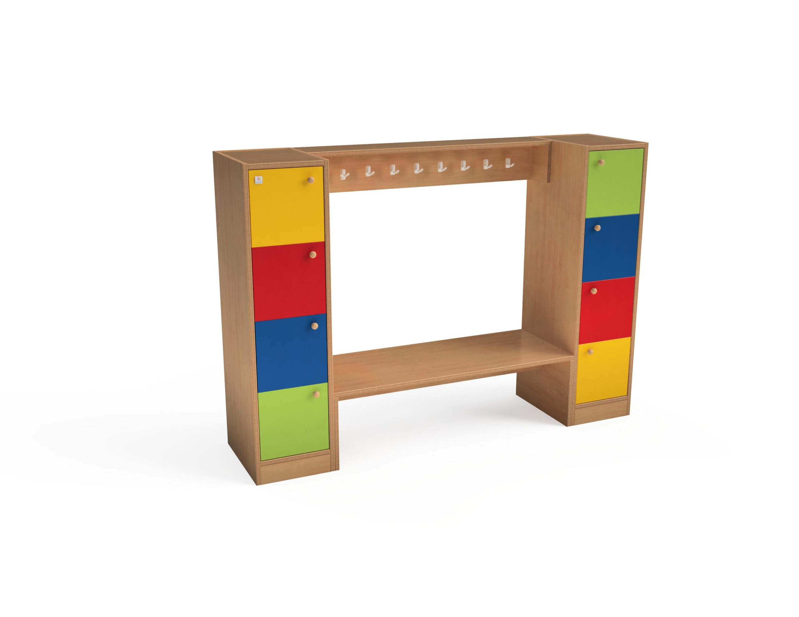 Garderoba Vita za 8 djece s klupicom i 8 vješalica. Ormarići su zatvoreni. Vrata je moguće kombinirati prema željama. Izrađen od materijala po izboru u debljini od 18 mm. Stražnja strana izrađena od istog materijala. Spajan je bez vidljivih spojeva. Fronte vrata mogu biti izrađene u boji po izboru iz palete boja koje nudimo. Na garderobu uključena je bukova ručkica lakirana visokokvalitetnim bezbojnim lakom na bazi vode, koja se spaja bez vidljivog spoja na vrata te tako daje dugotrajnost u korištenju. Pružamo mogućnost ugradnje drugih dizajnerskih ručkica prema želji i potrebi. Vrata se mogu urediti aplikacijom po izboru.