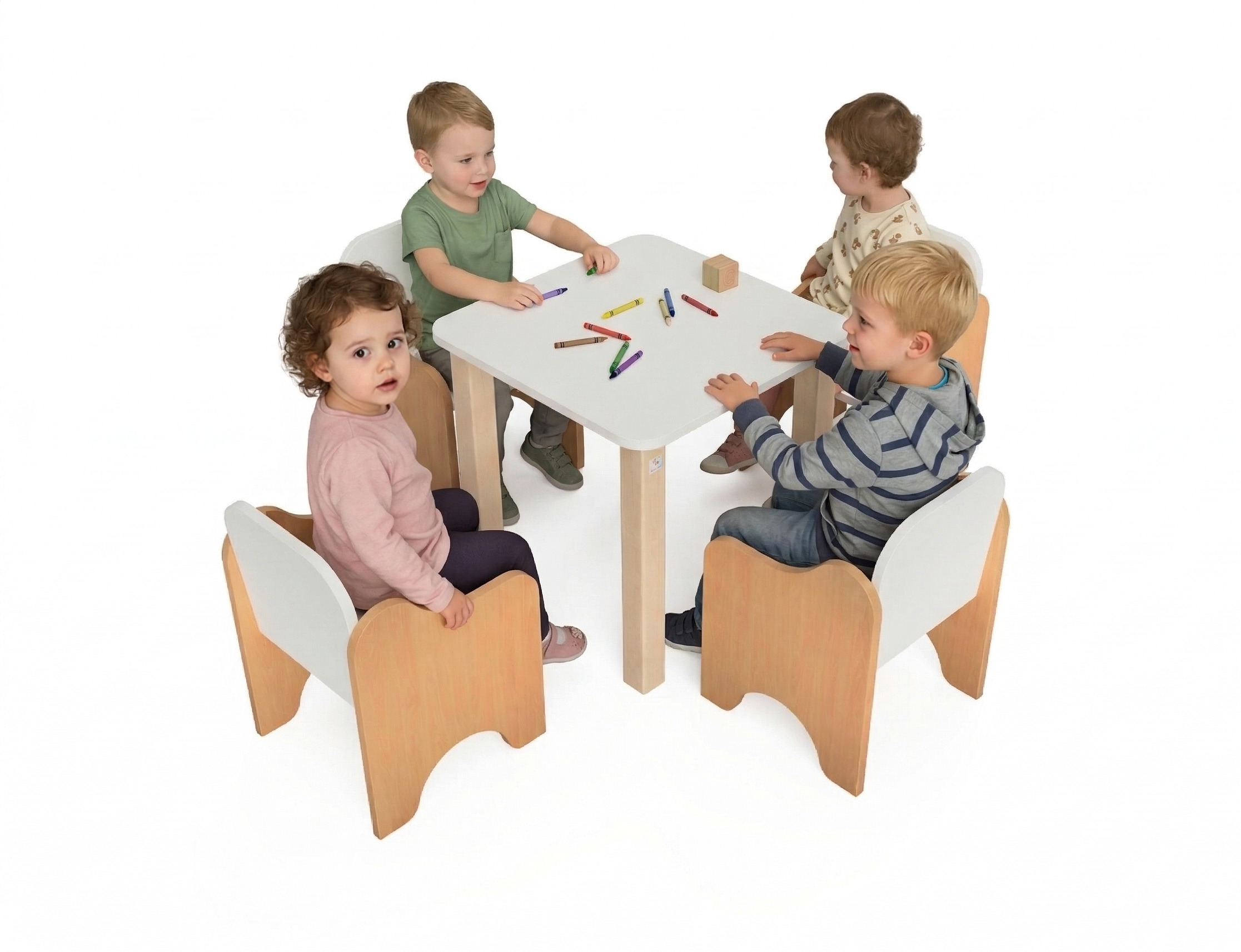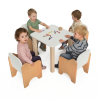 Garnitura za sjedenje Foteljice izrađena od oplemenjeni iveral – Bukva 18 mm sa zaobljenim rubovima r 2 mm. Atraktivnog i privlačnog dizajna. Spajana je bez vidljivih spojeva. Fronte sjedalica, naslona i stola mogu biti izrađene u boji po izboru iz palete boja.
