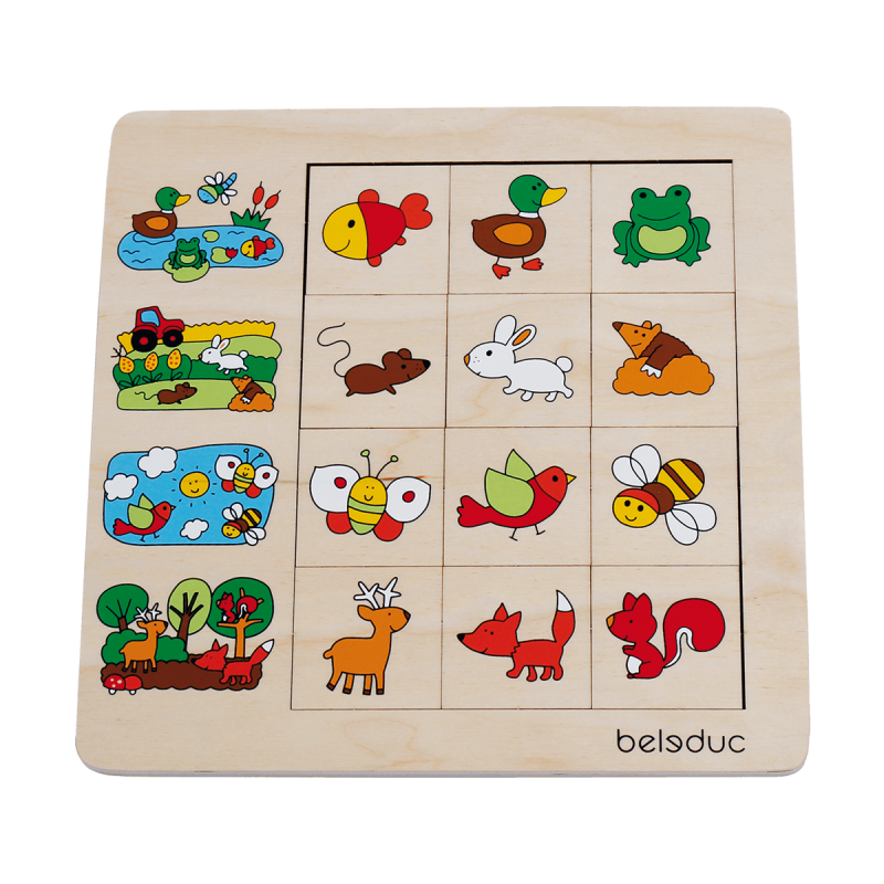 Elementi na drvenim slagalicama sortiraju se prema različitim situacijama u okolišu na drvenoj ploči što omogućuje jednostavno sortiranje te samostalnu provjeru.