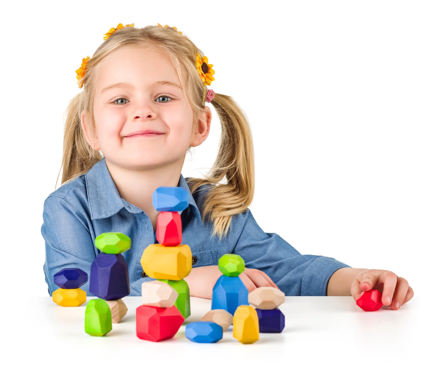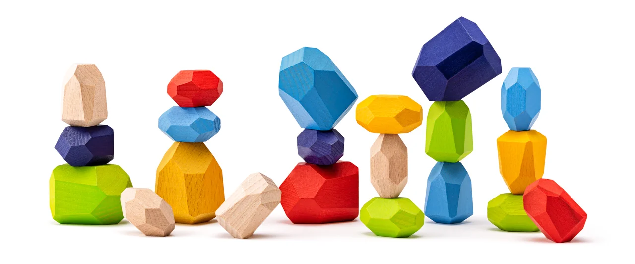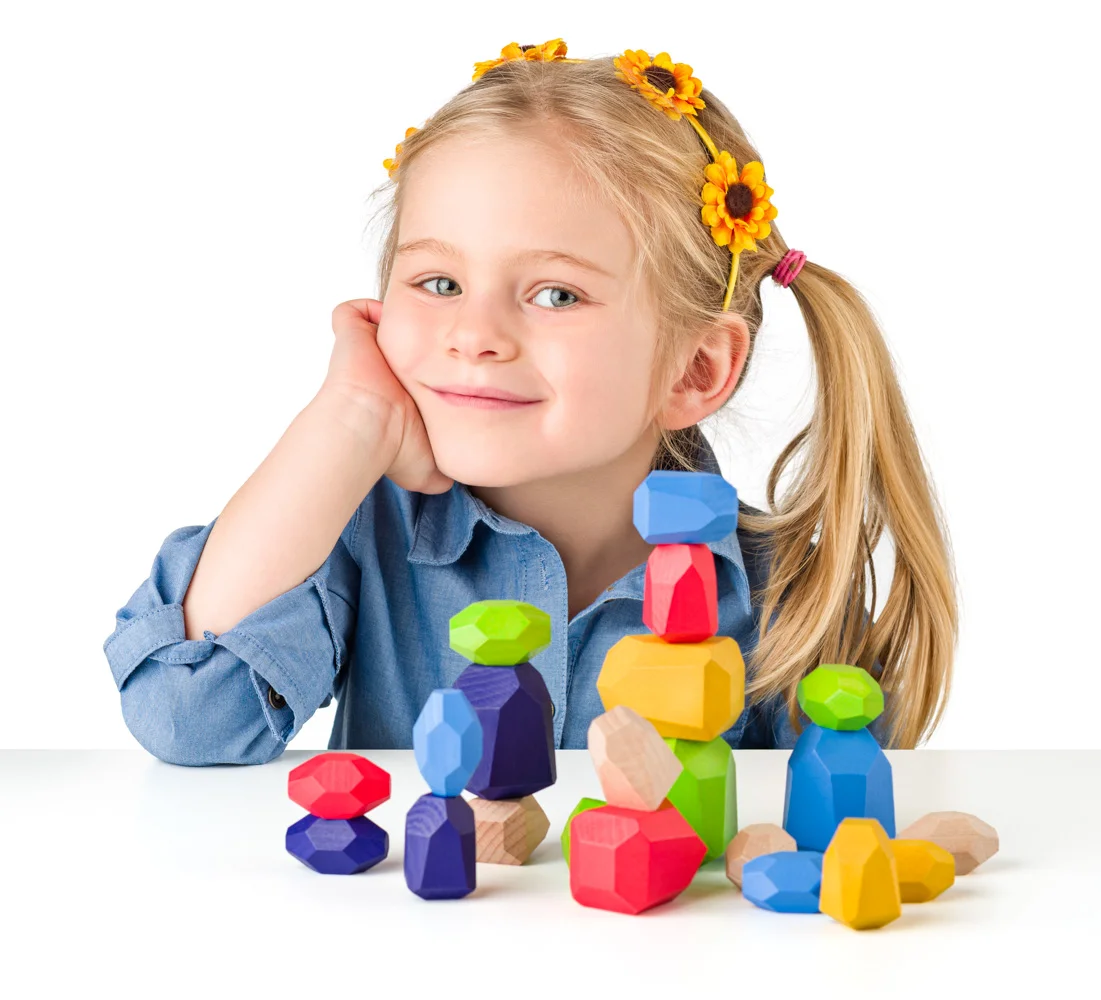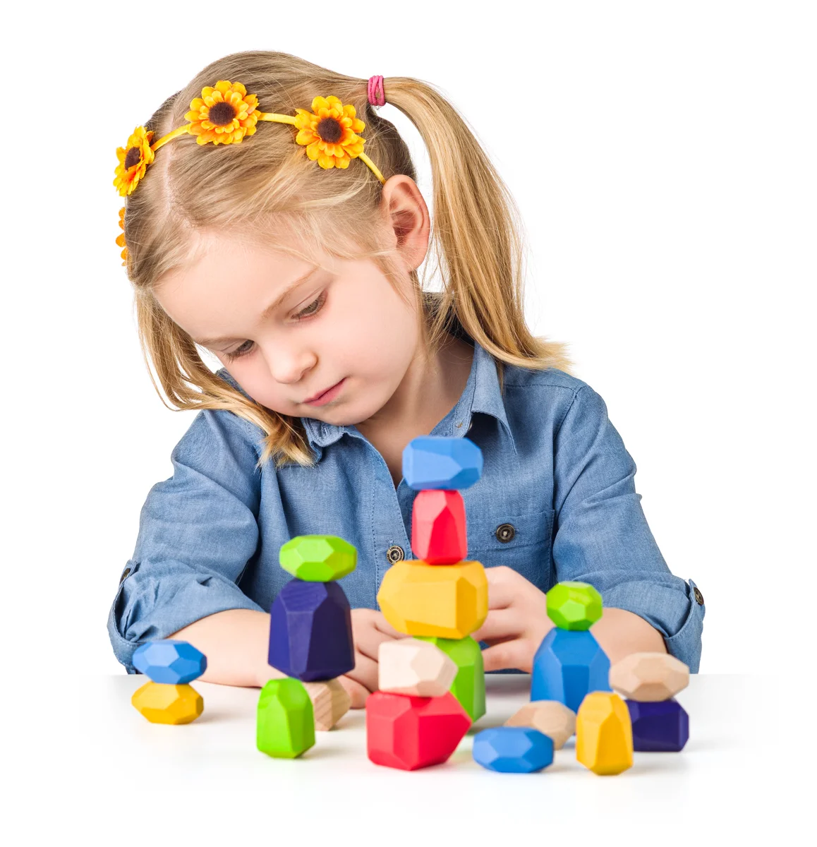 Šareni dizajn kamenčića privlači dječju pažnju te potiče razvoj njihove vizualne percepcije. Stavljanjem kamena jedan na drugi potiče se razvoj strpljenja, okulomotorne koordinacije i preciznosti djece.
