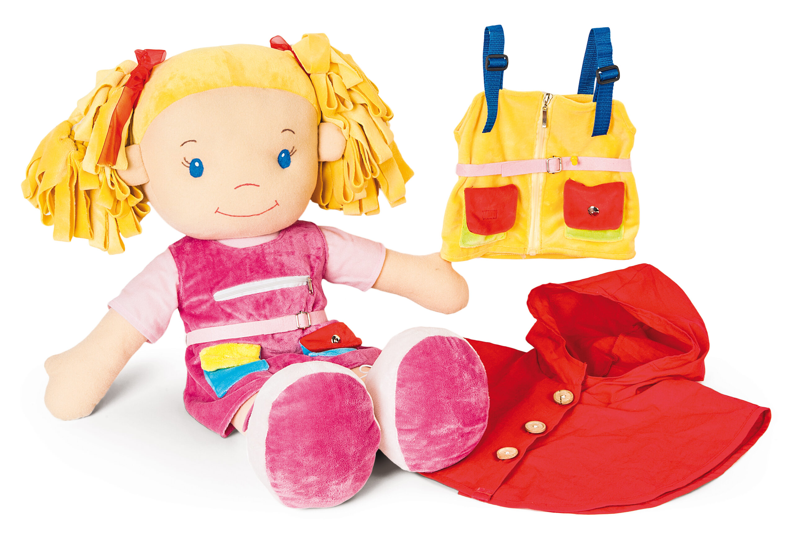 Velika krpena lutka koja pomaže u razvoju fine motorike. Odjeća lutke ima različite načine kopčanja. Odjeća lutke napravljena je u više slojeva. Tijelo lutke je mekano.