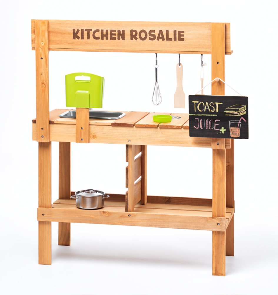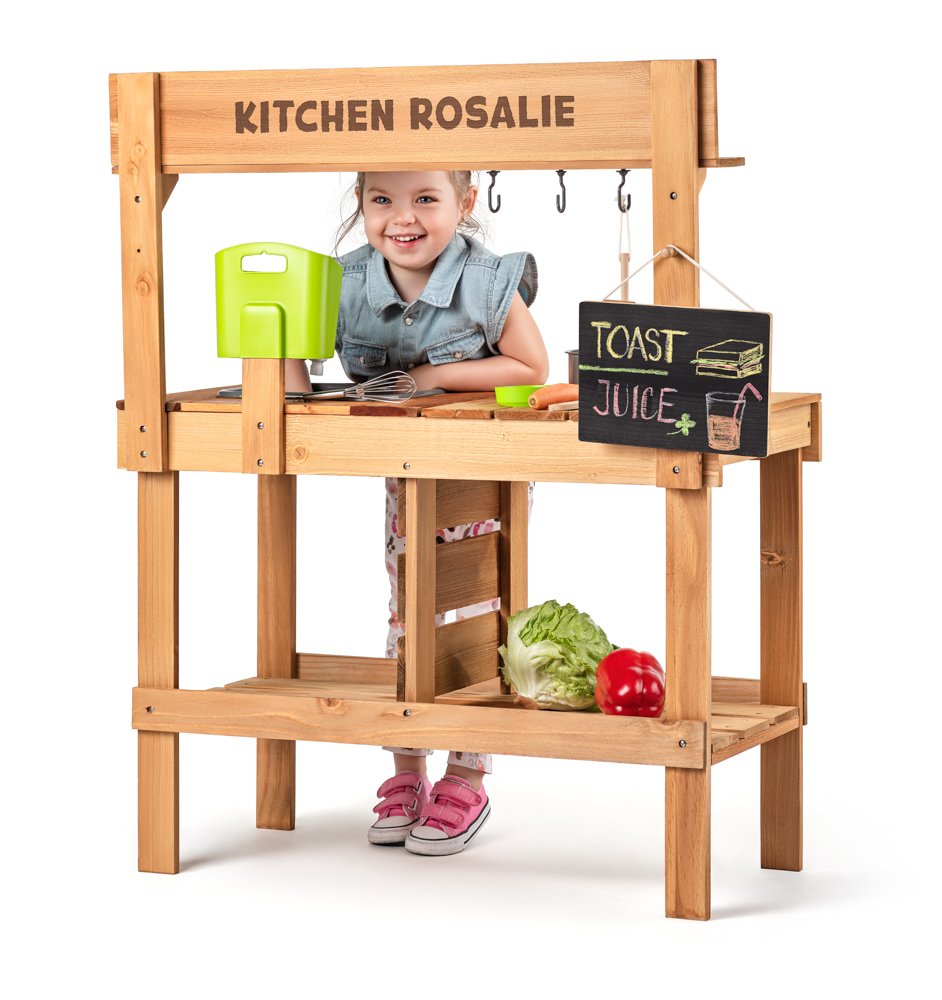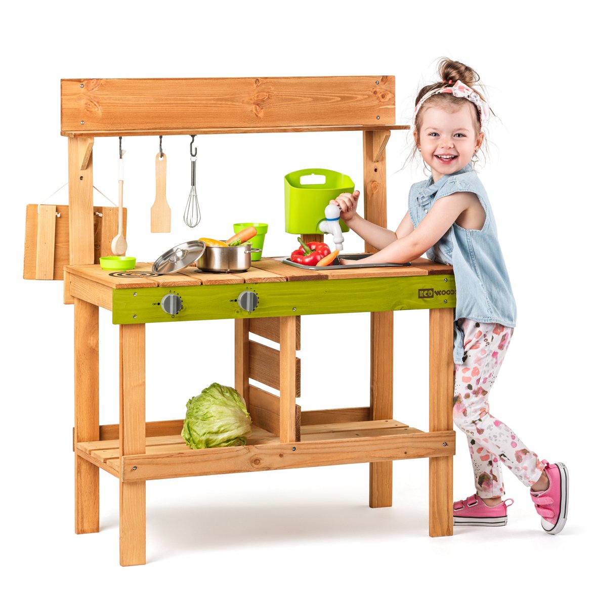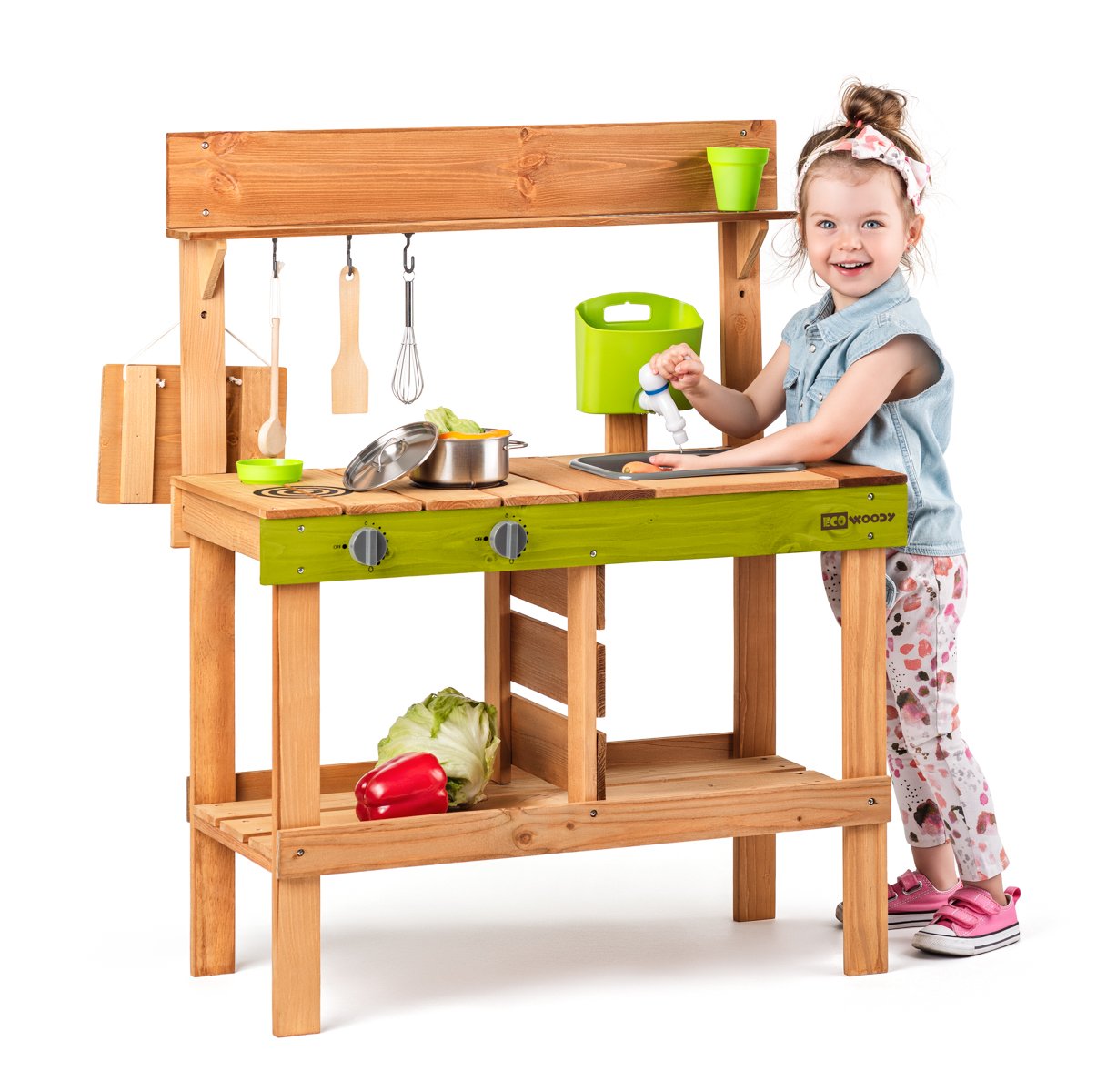 Ova čvrsta drvena kuhinja za vanjsku igru pruža djeci beskrajne mogućnosti maštovite zabave na otvorenom. Izrađena je od kvalitetnog, prirodnog drva koje je posebno obrađeno kako bi izdržalo vanjske uvjete, idealna je za dvorišta, terase i vrtićke prostore. Kombinacija drva i zelenih detalja stvara privlačan, ekološki izgled koji se savršeno uklapa u svako okruženje.