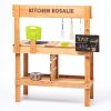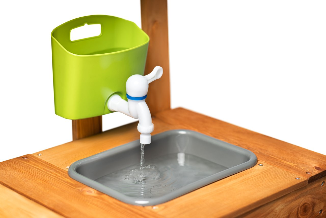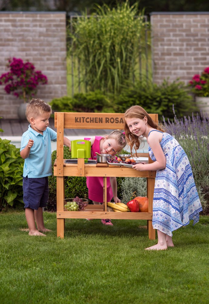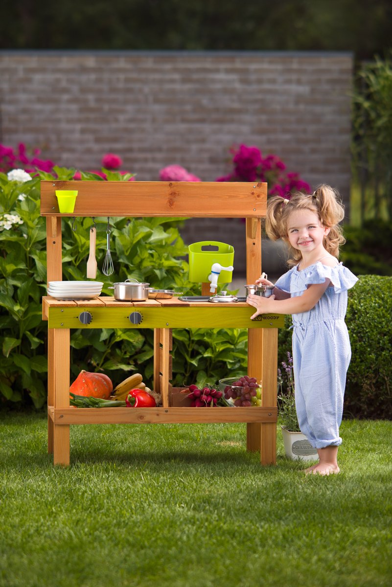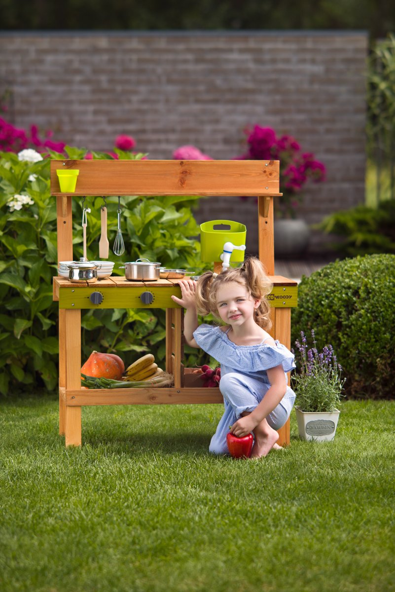 Ova čvrsta drvena kuhinja za vanjsku igru pruža djeci beskrajne mogućnosti maštovite zabave na otvorenom. Izrađena je od kvalitetnog, prirodnog drva koje je posebno obrađeno kako bi izdržalo vanjske uvjete, idealna je za dvorišta, terase i vrtićke prostore. Kombinacija drva i zelenih detalja stvara privlačan, ekološki izgled koji se savršeno uklapa u svako okruženje.