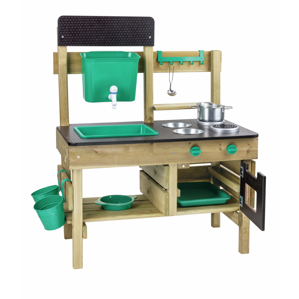Kuhinja za vanjsku upotrebu uključuje funkcionalan spremnik za vodu i sudoper. Također, djeca mogu presaditi ili posaditi biljku na visećim posudicama za biljke.