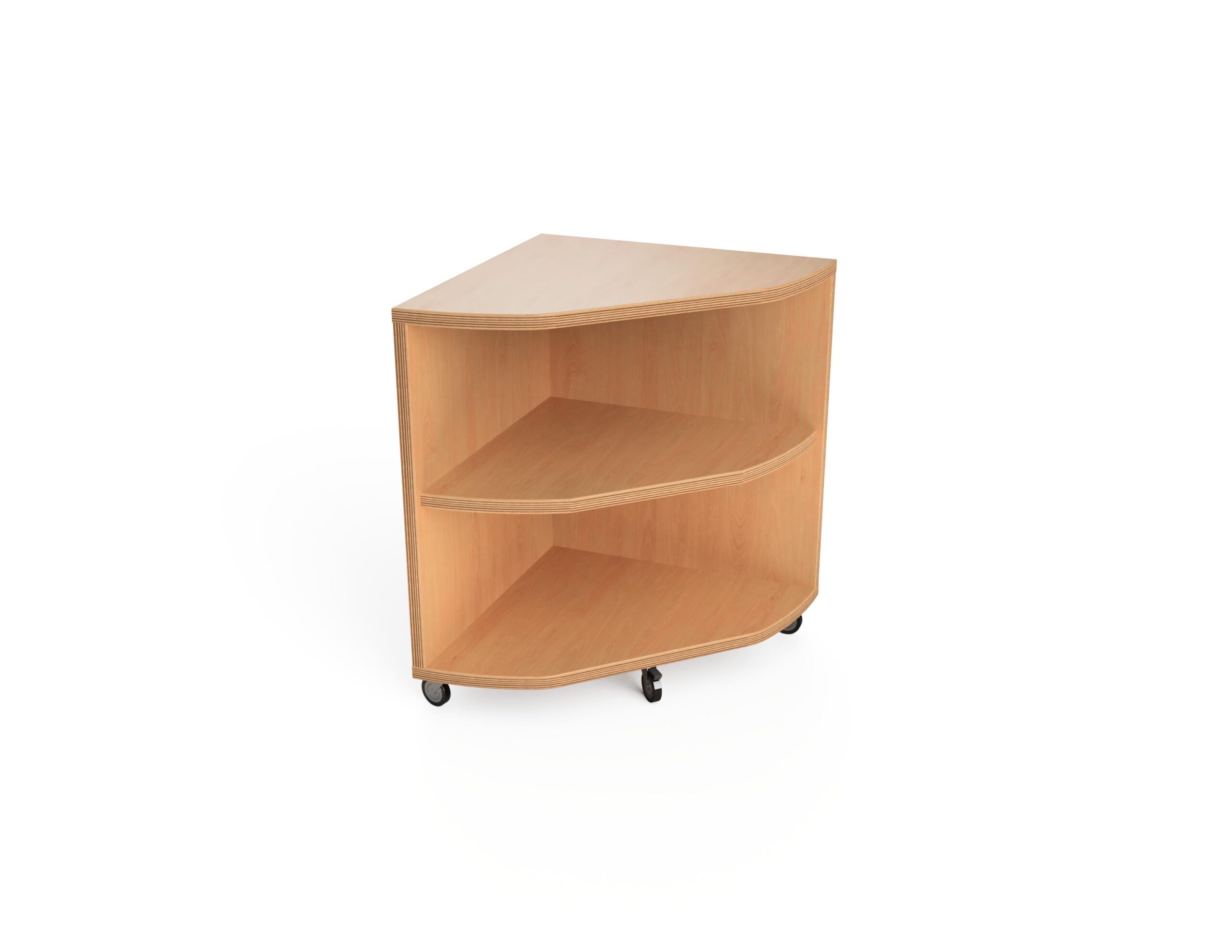 Kutni ormar sadrži 2 otvorene police. Samostalno stoji u kutovima prostorija ili kao završni element nekog seta u prostoru. Lijepo se kombinira s ostalom kolekcijom namještaja. Izrađen od materijala po izboru u debljini od 18 mm. Spajan je bez vidljivih spojeva. Ormarić s podnožjem na izbor: drvena sokla, metalni kotači i metalne nogice. Stražnja strana izrađena od istog materijala.