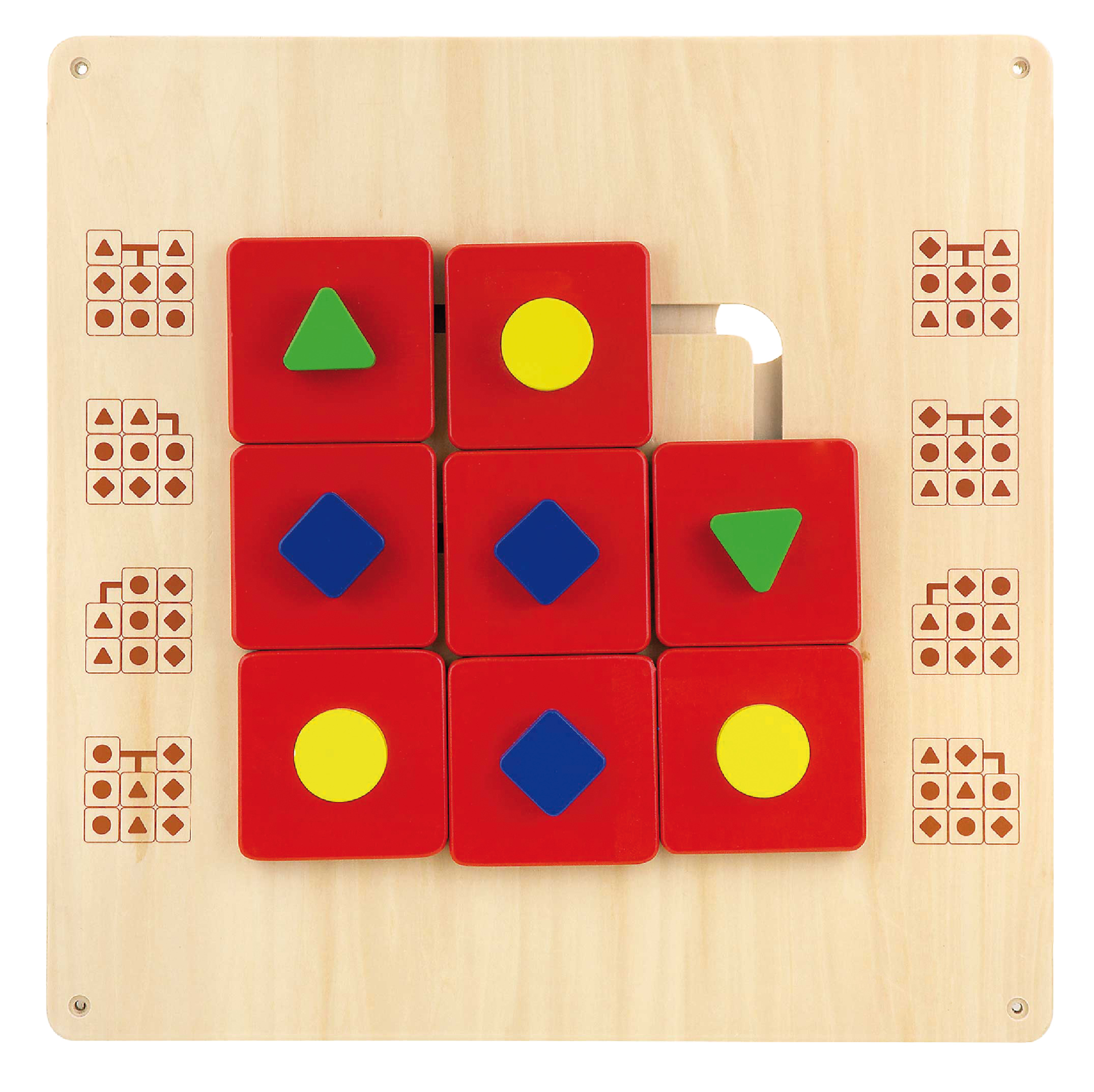 Manipulativni labirint koji sadrži različite geometrijske oblike u svrhu smještanja istih prema 8 zadanih uzoraka oslikanim sa strane.