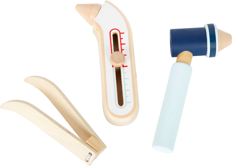 Inovativan, sveobuhvatan set za igru liječnika za igru uloge liječnik – pacijent. Kompletan set uključuje termometar, dječju platnenu masku, međuspremnik, ampule za hitne slučajeve s utorom za igračku štrcaljku, sprej za dezinfekciju s mehanizmom na pumpicu, vrećicu za infuziju, flaster s kukicama, spremnik za tablete, igračka štrcaljka s mehanizmom za potiskivanje, cijev za melem, stetoskop, skalpel, pinceta i igračka radio.