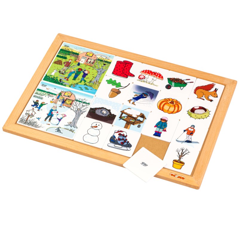 Dva seta slagalica na temu godišnjih doba. Djeca moraju pravilno posložiti 8 sličica uz svako godišnje doba. Osim zabave, služe za edukaciju osnovnim obilježjima svakog godišnjeg doba te po čemu se ono razlikuje.