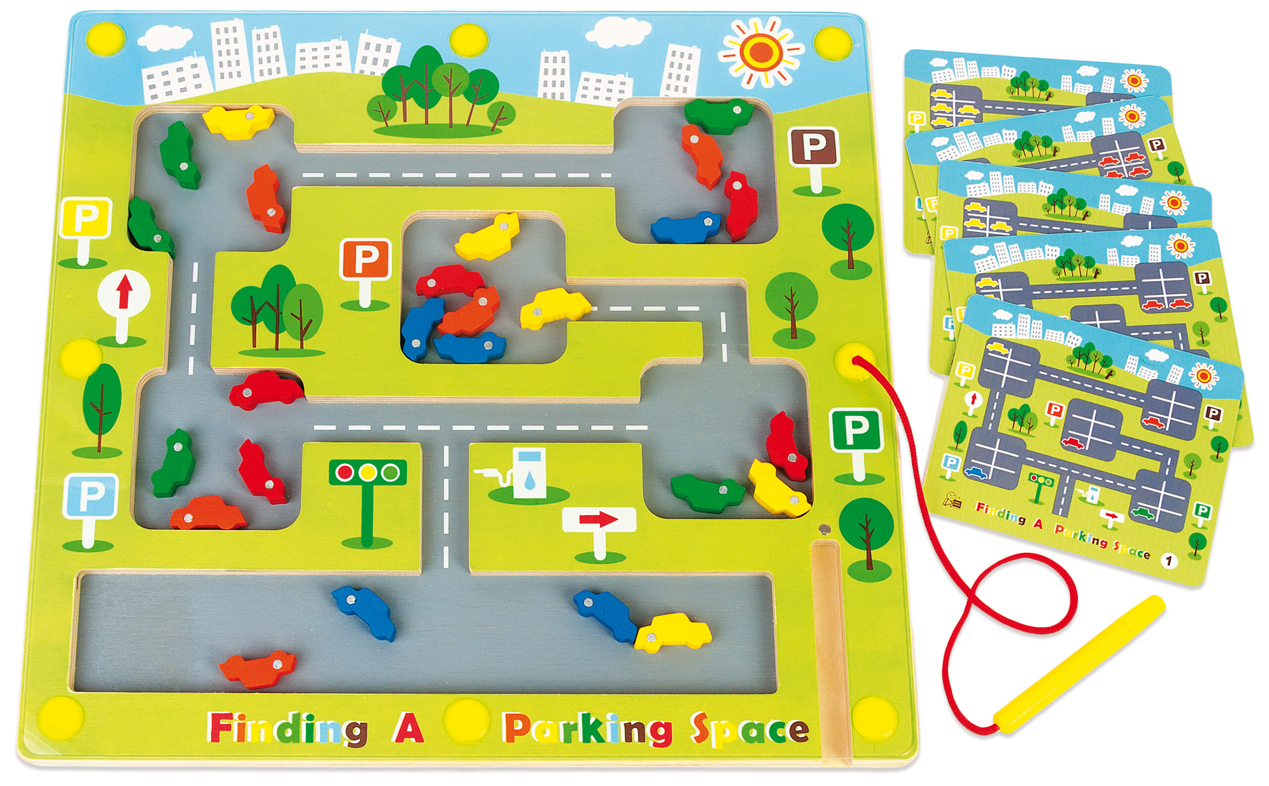 Magnetni labirint odličan za razvoj koordinacije pokreta, logičko razmišljanje i vizualno praćenje predmeta. Vozite autiće po cesti i odvezite ih na njihovo parkirno mjesto. U setu kartice sa zadatcima.
