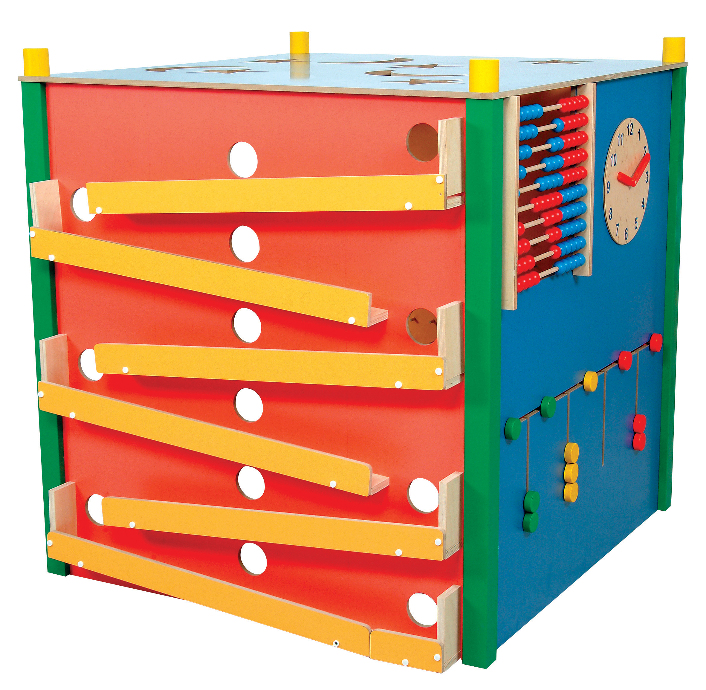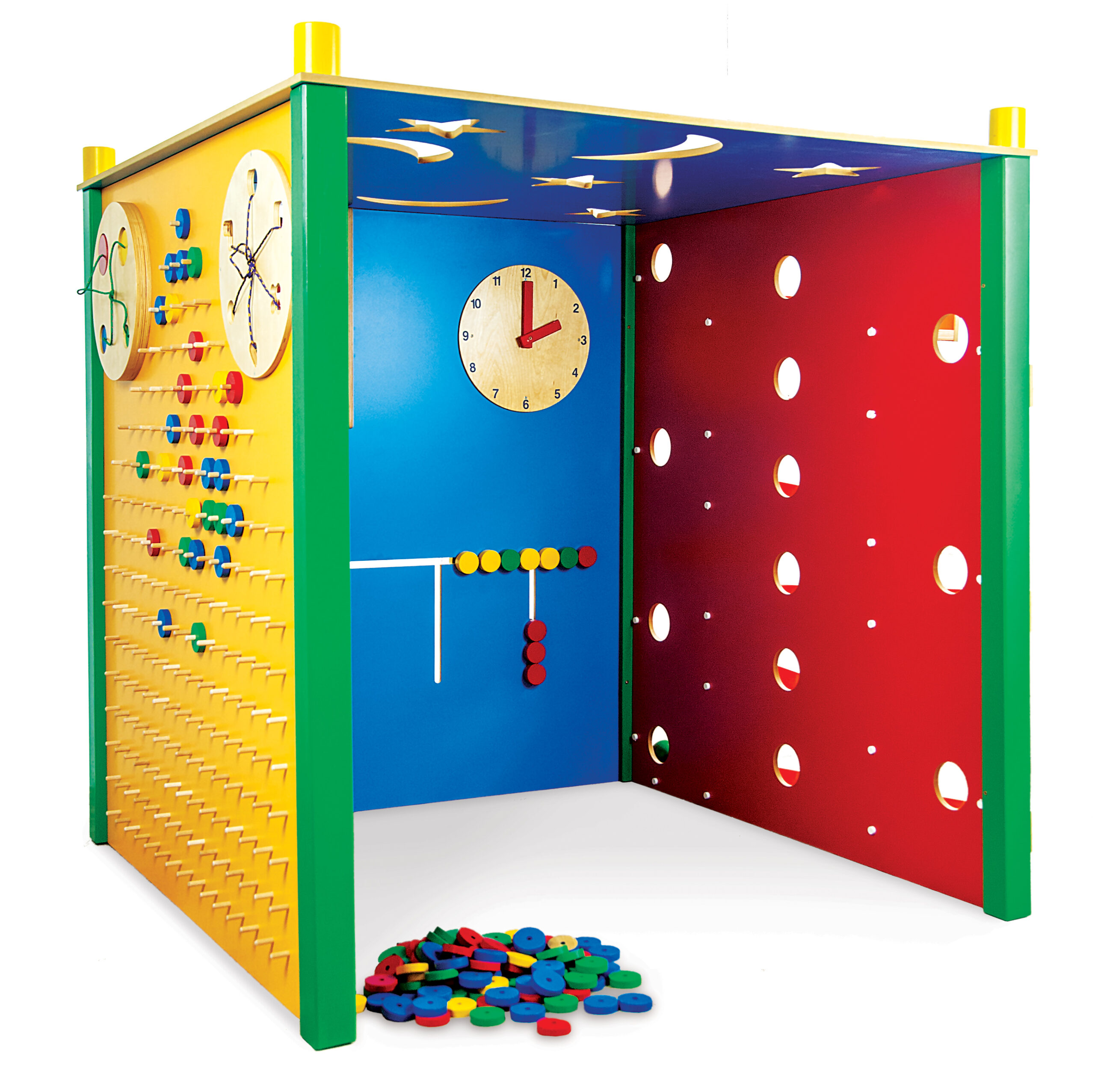 Izrađena od 12 mm MDF ploče u crvenoj, plavoj i žutoj boji. Manipulativna kuća za igru omogućava da više djece stoje u blizini zidova u isto vrijeme te je dostupan ulaz u istu i za djecu u invalidskim kolicima. Dvostrani mozaik s drvenim prstenovima potiče različite grupne aktivnosti. Drvene, lako podesive staze služe za put drvenih loptica dok dvostrani labirint, okvir za brojanje i sat pomaže djeci u prepoznavanju ritma, boja i oblika. Zahvaljujući njima, potiče se razvoj dječjih predmatematičkih i predčitalačkih vještina. Mjeseci i zvijezde na zidu i na stropu stvaraju bajkovit ugođaj.