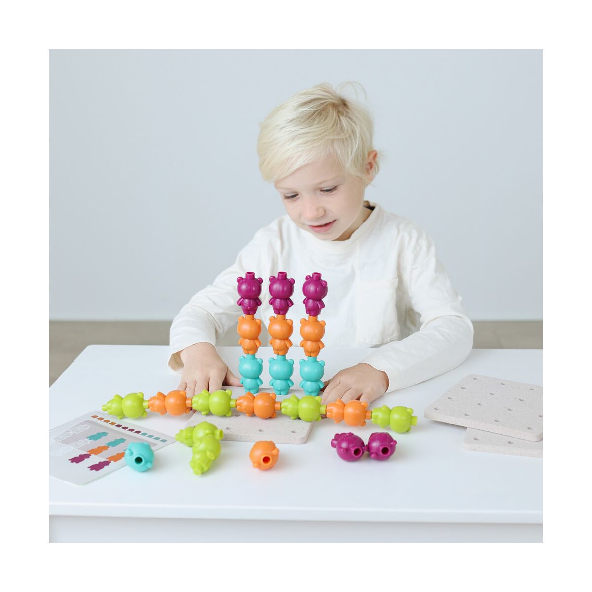 Odlična igra za poticanje dječje pažnje, koncentracije, okulomotorne koordinacije kao i upoznavanje djece s osnovnim matematičkim konceptima. Na edukativan način razvijaju predmatematičke vještine – uče o brojevima, sortiranju, pozicioniranju.