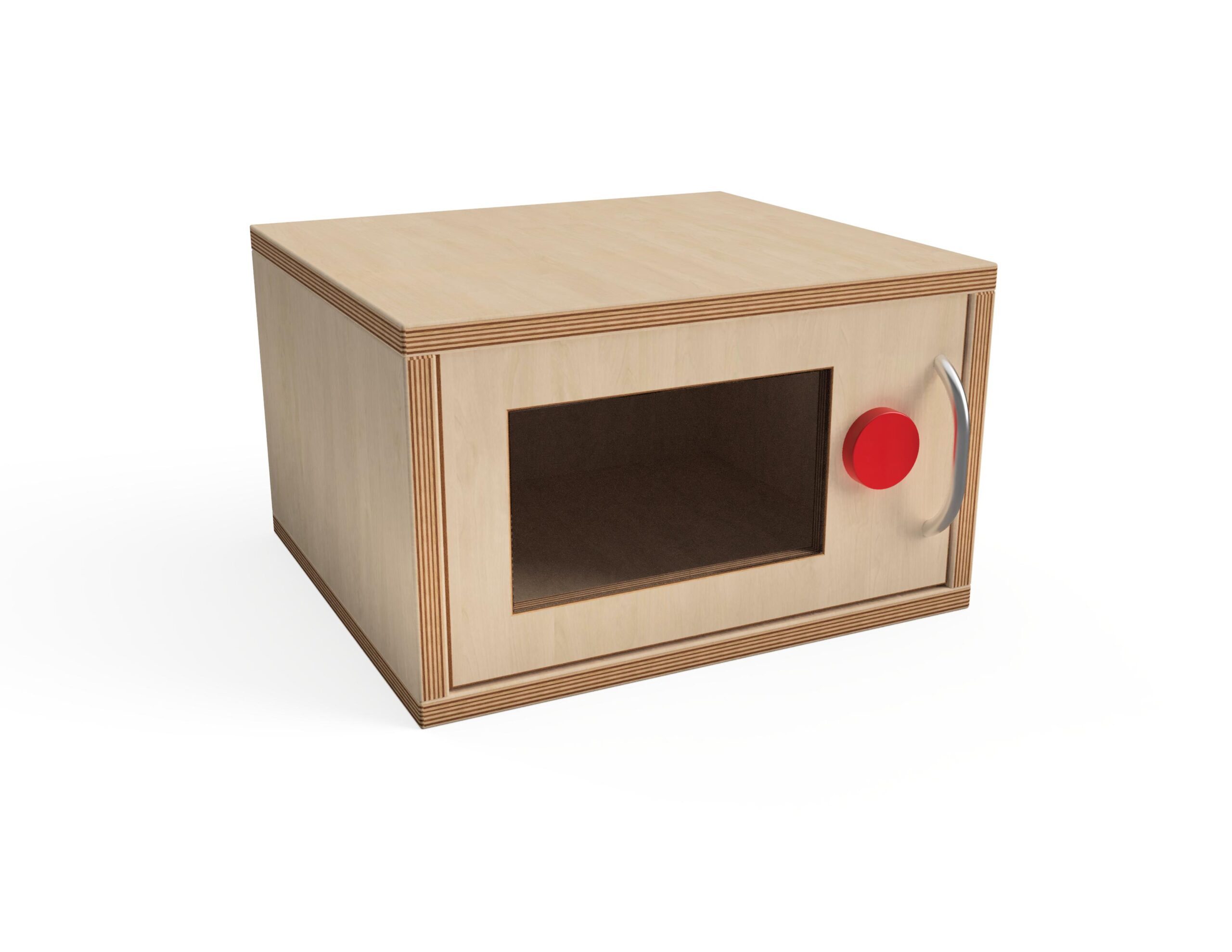 Mikrovalna pećnica od oplemenjenog iverala s vratima od pleksiglasa. Izrađen od materijala po izboru u debljini od 18 mm. Spajan je bez vidljivih spojeva. Ormarić s podnožjem na izbor: drvena sokla, metalni kotači i metalne nogice.