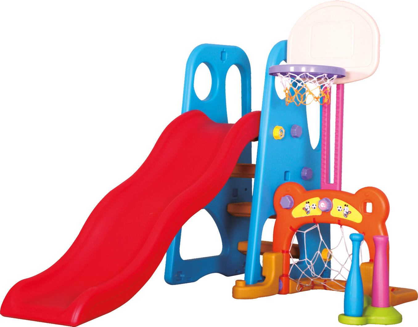 Mini igralište s toboganom, košem i setom za kuglanje. Izvrsne stabilnosti, sigurne stepenice i ručke za držanje na vrhu tobogana.