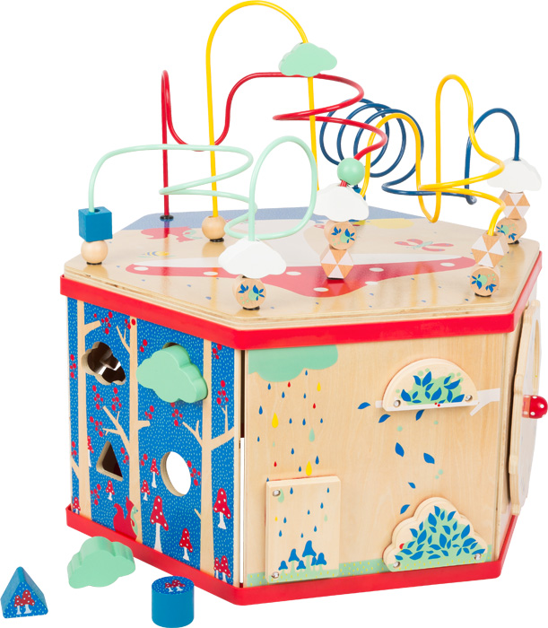 Motorička kocka sadrži različite elemente za istraživanje poput pomičnih drvenih pločica za igru pamćenja, igru pretraživanja s ježom, sat s godišnjim dobima, pomične kotačiće sa zupčanicima i labirint. Poklopac se lako i jednostavno skida te daje mogućnost okretanja istog te može poslužiti kao stol ili stolac.