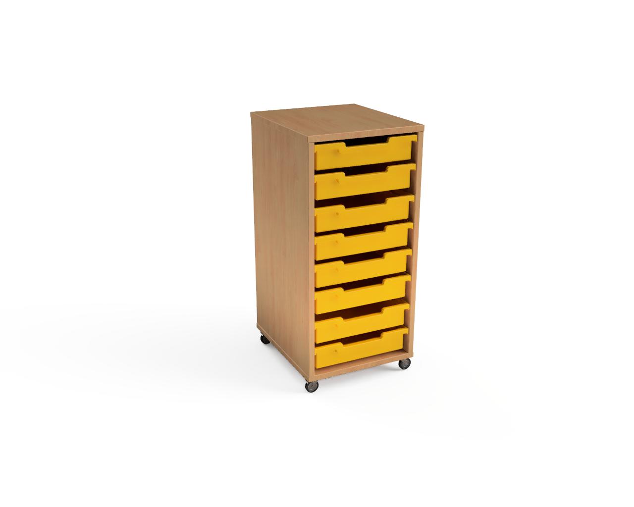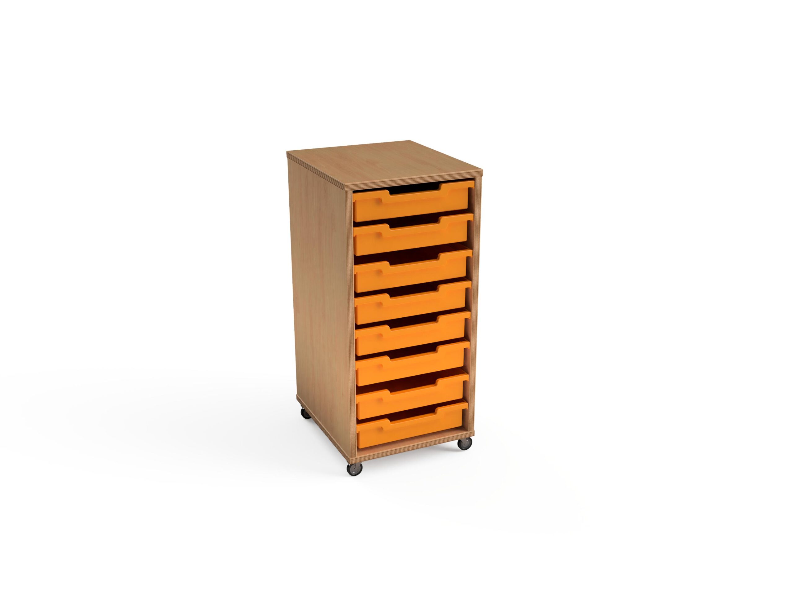 Ormar za kutije. Izrađen od materijala po izboru u debljini od 18 mm. Spajan je bez vidljivih spojeva. Ormarić s podnožjem na izbor: drvena sokla, metalni kotači i metalne nogice. Stražnja strana izrađena od istog materijala. Mogući je izabrati leđa obložena magnetnom pločom, pluto pločom, pločom za pisanje kredom, akrilnim ogledalo ili akrilnim leđima u boji. Kutija za spremanje igračaka, građevnih materijala i ostalih potrepština, može se koristiti kao ladica. Dostupna je u širokoj paleti boja.