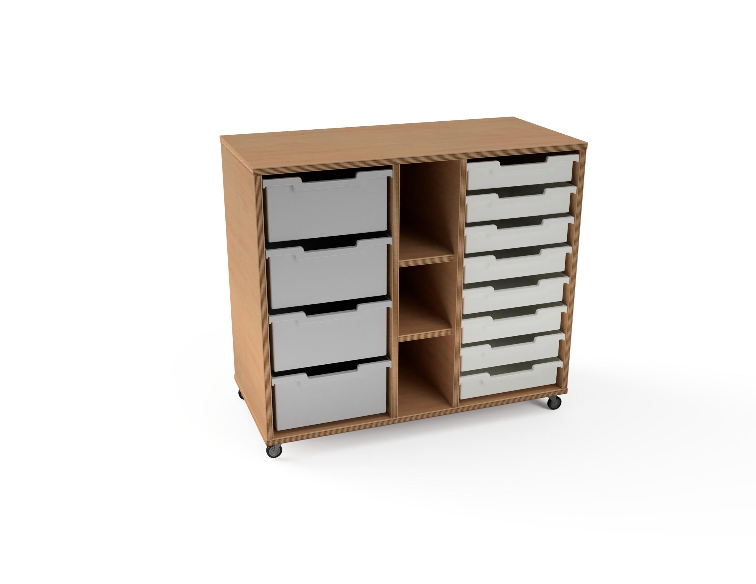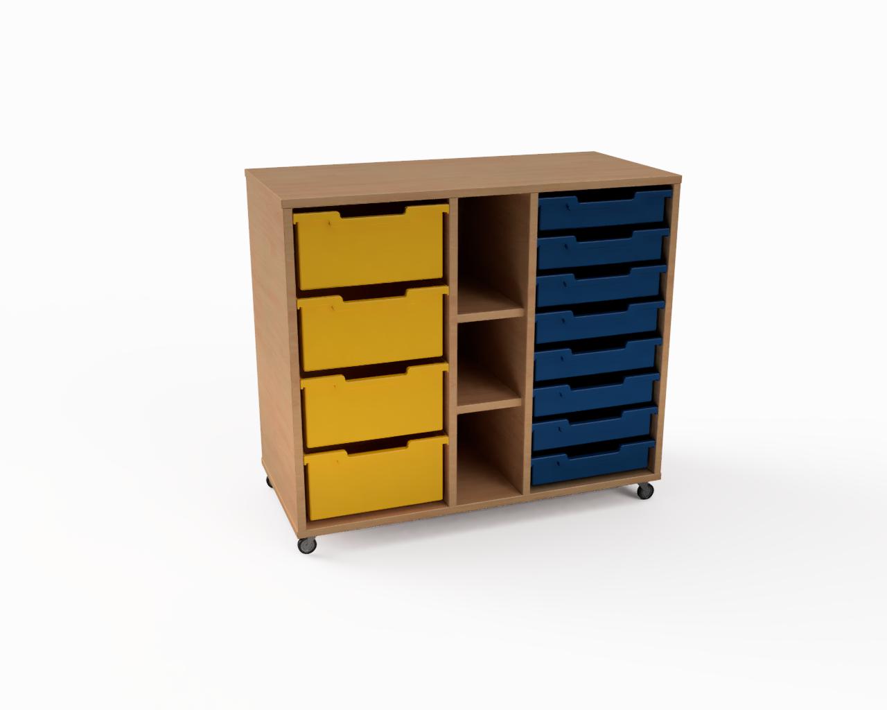 Ormar za kutije i dvije police. Izrađen od materijala po izboru u debljini od 18 mm. Spajan je bez vidljivih spojeva. Ormarić s podnožjem na izbor: drvena sokla, metalni kotači i metalne nogice. Stražnja strana izrađena od istog materijala. Mogući je izabrati leđa obložena magnetnom pločom, pluto pločom, pločom za pisanje kredom, akrilnim ogledalo ili akrilnim leđima u boji. Kutija za spremanje igračaka, građevnih materijala i ostalih potrepština, može se koristiti kao ladica. Dostupna je u širokoj paleti boja.