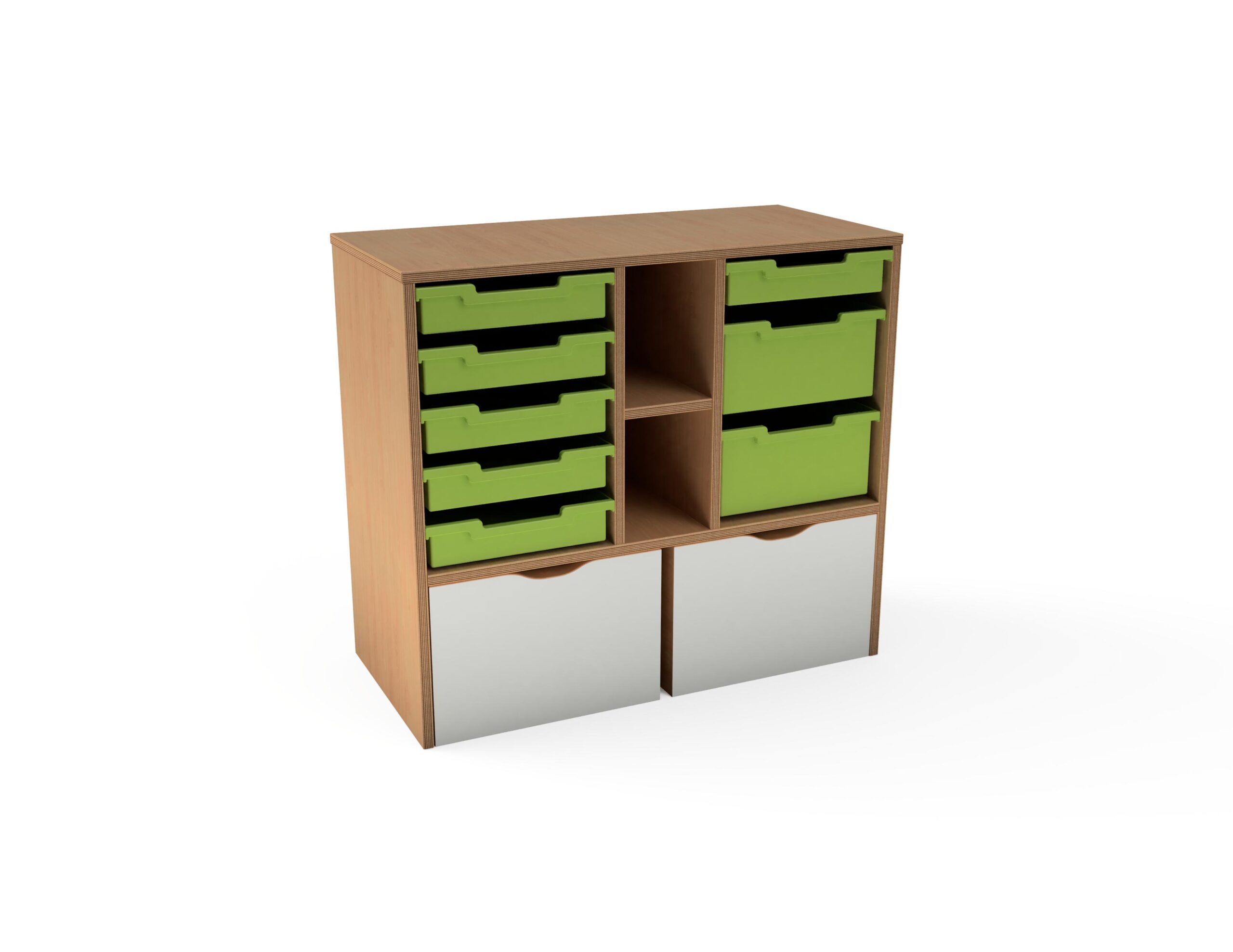 Ormar za kutije i s dvije police. Kutije se naručuju zasebno. Dvije kutije na kotačima uključene u cijenu. Izrađen od materijala po izboru u debljini od 18 mm. Spajan je bez vidljivih spojeva. Ormarić s podnožjem na izbor: drvena sokla, metalni kotači i metalne nogice. Stražnja strana izrađena od istog materijala. Mogući je izabrati leđa obložena magnetnom pločom, pluto pločom, pločom za pisanje kredom, akrilnim ogledalo ili akrilnim leđima u boji. Kutija za spremanje igračaka, građevnih materijala i ostalih potrepština, može se koristiti kao ladica. Dostupna je u širokoj paleti boja.