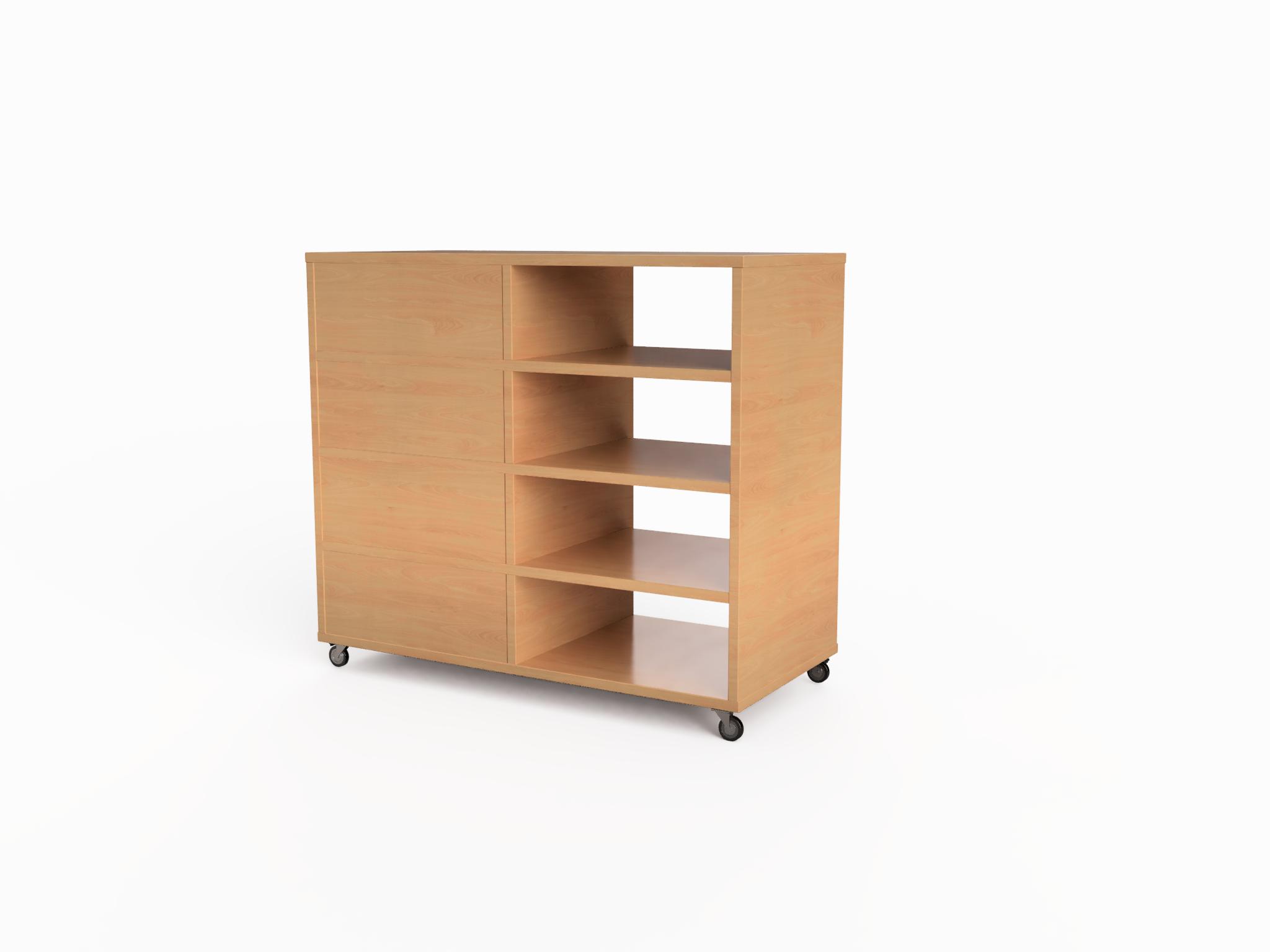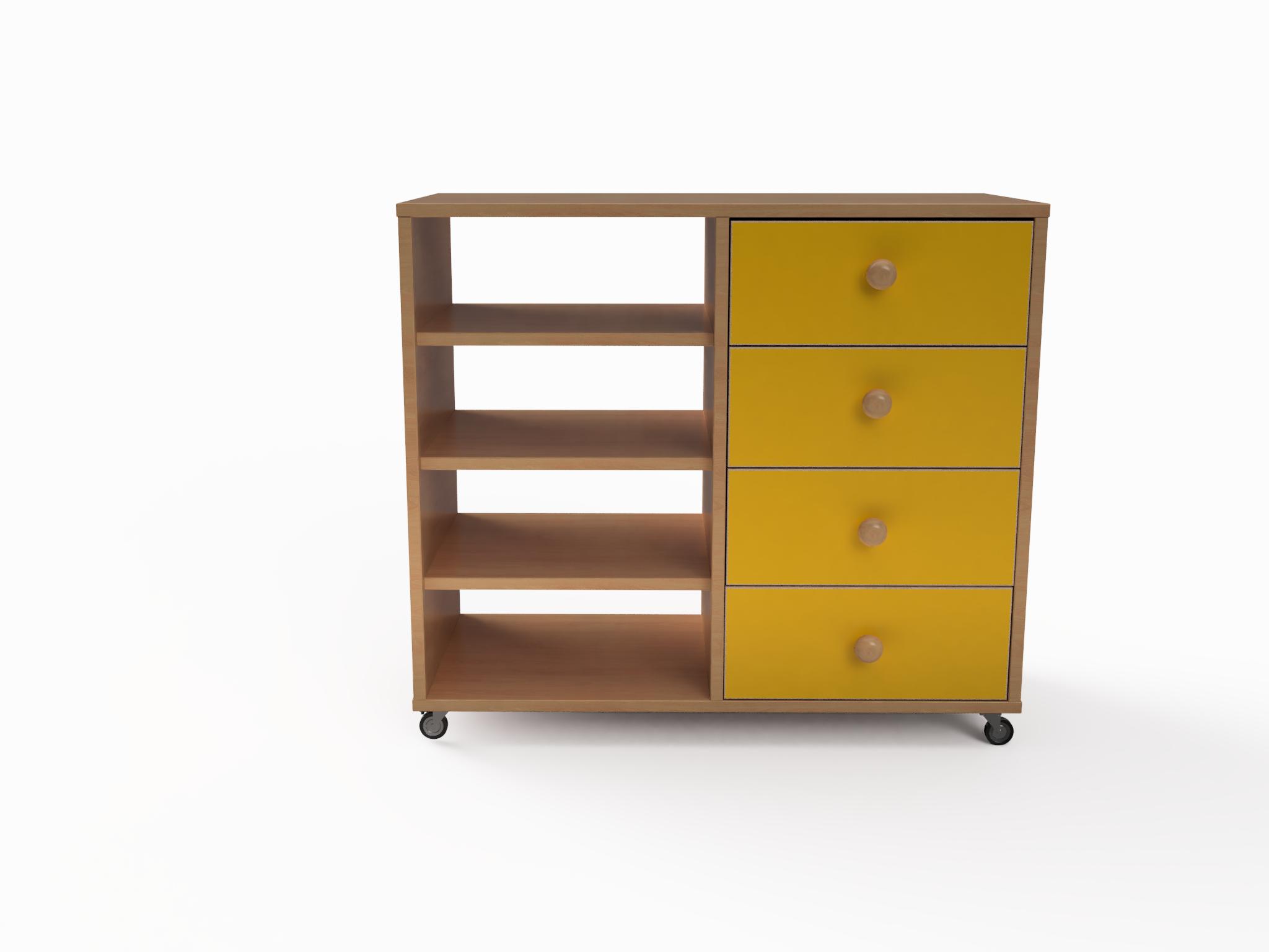 Ormar obostrano otvoreni s 4 police i 4 ladice s leđima. Izrađen od materijala po izboru u debljini od 18 mm. Spajan je bez vidljivih spojeva. Ormarić s podnožjem na izbor: drvena sokla, metalni kotači i metalne nogice. Stražnja strana izrađena od istog materijala. Moguće je izabrati leđa obložena magnetnom pločom, pluto pločom, pločom za pisanje kredom, akrilnim ogledalo ili akrilnim leđima u boji. Fronte ladica mogu biti izrađene u boji po izboru iz palete boja koje nudimo. Na ormar je uključena bukova ručkica lakirana visokokvalitetnim bezbojnim lakom na bazi vode, koja se spaja bez vidljivog spoja na vrata i ladice te tako daje dugotrajnost u korištenju. Pružamo mogućnost ugradnje drugih dizajnerskih ručkica prema želji i potrebi.