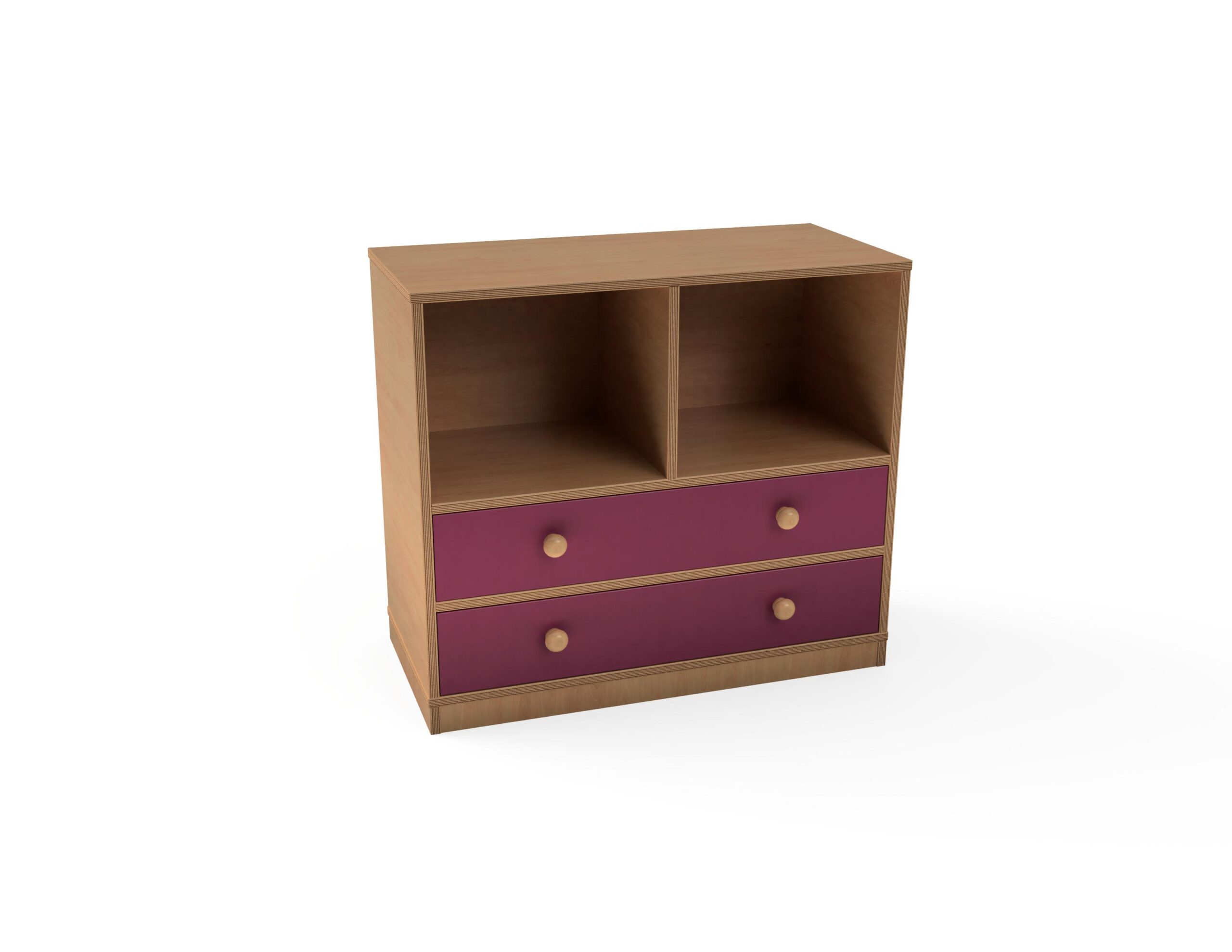 Ormar s dva pretinca i dvije ladice. Izrađen od materijala po izboru u debljini od 18 mm. Spajan je bez vidljivih spojeva. Ormarić s podnožjem na izbor: drvena sokla, metalni kotači i metalne nogice. Stražnja strana izrađena od istog materijala. Mogući je izabrati leđa obložena magnetnom pločom, pluto pločom, pločom za pisanje kredom, akrilnim ogledalo ili akrilnim leđima u boji. Fronte vrata mogu biti izrađene u boji po izboru iz palete boja koje nudimo. Na ormar uključena je bukova ručkica lakirana visokokvalitetnim bezbojnim lakom na bazi vode, koja se spaja bez vidljivog spoja na vrata i ladice te tako daje dugotrajnost u korištenju. Pružamo mogućnost ugradnje drugih dizajnerskih ručkica prema želji i potrebi. Vrata se mogu urediti aplikacijom po izboru.