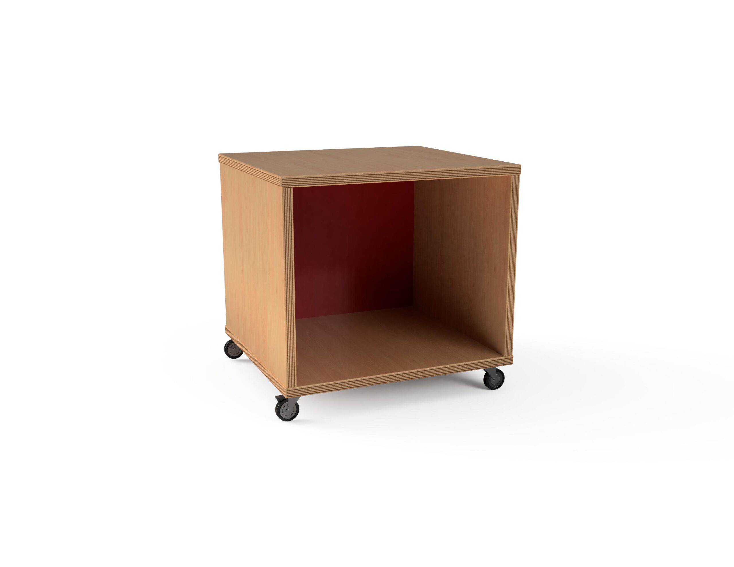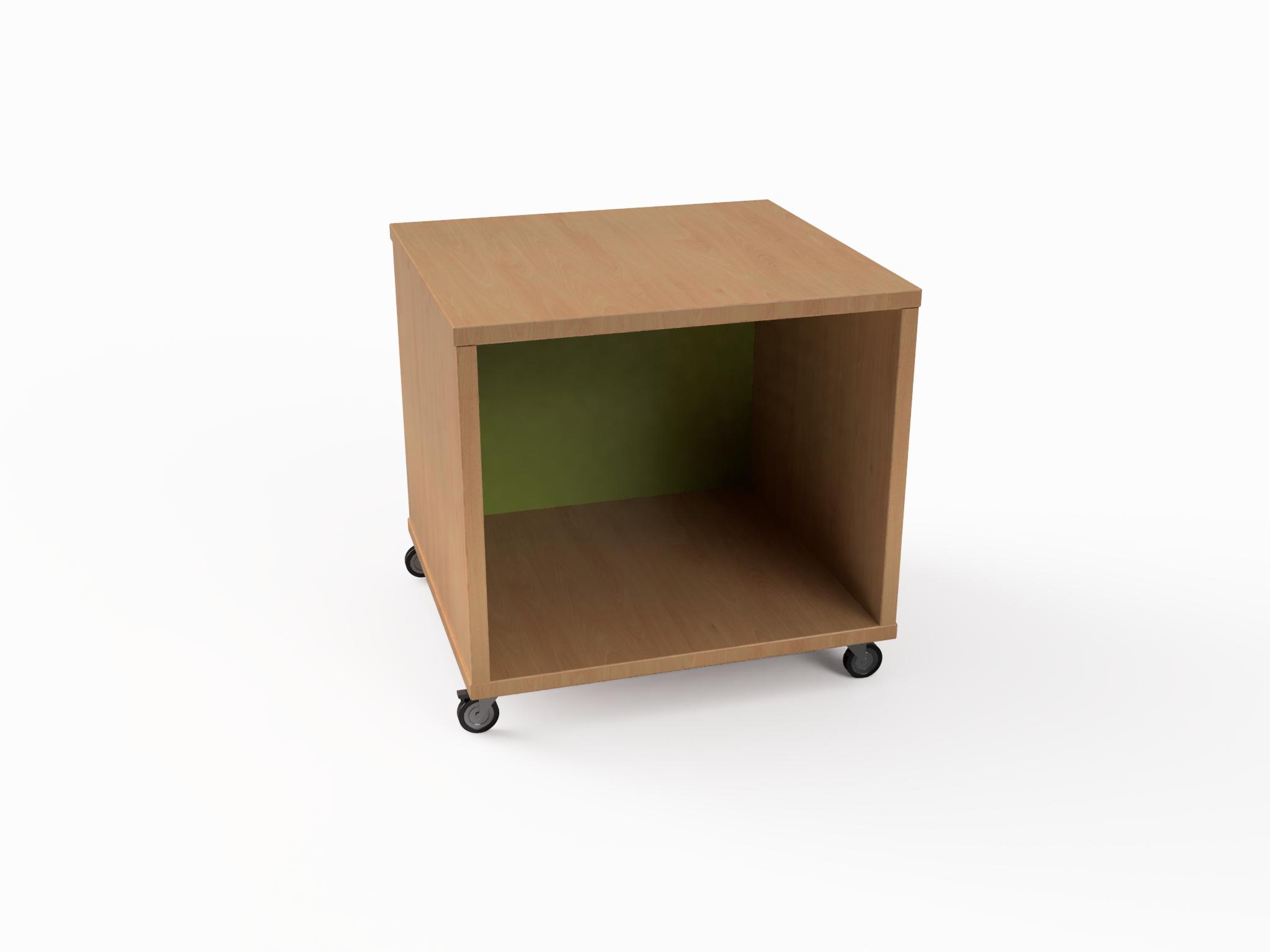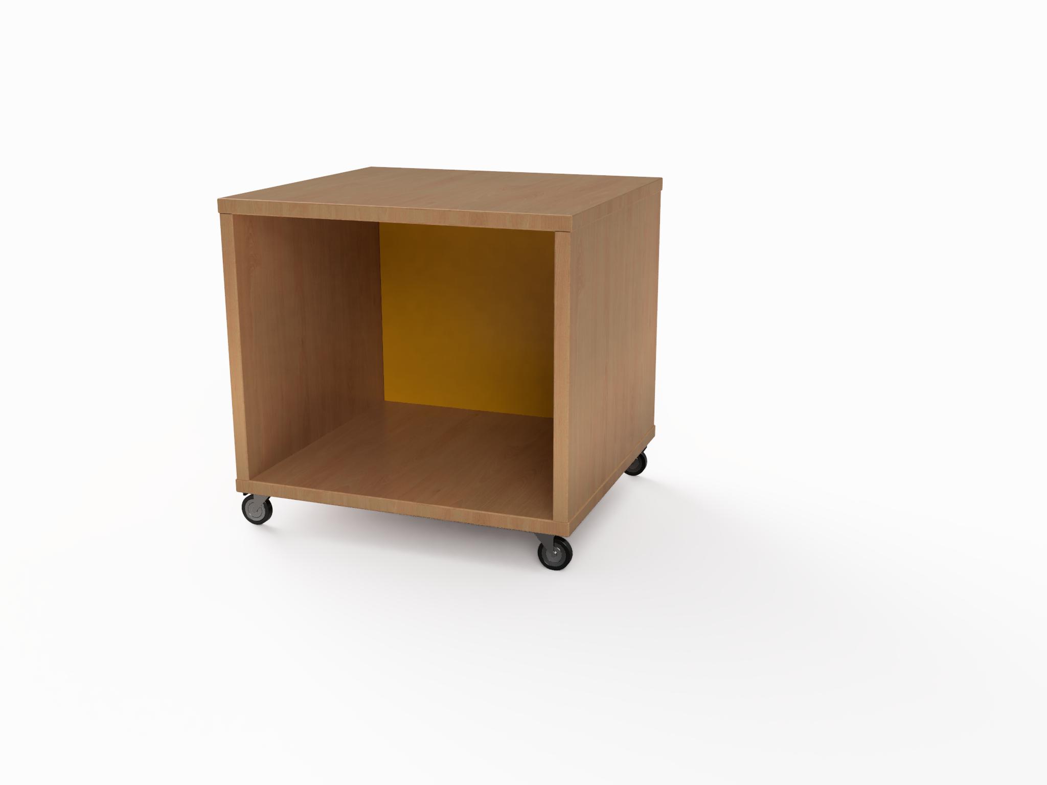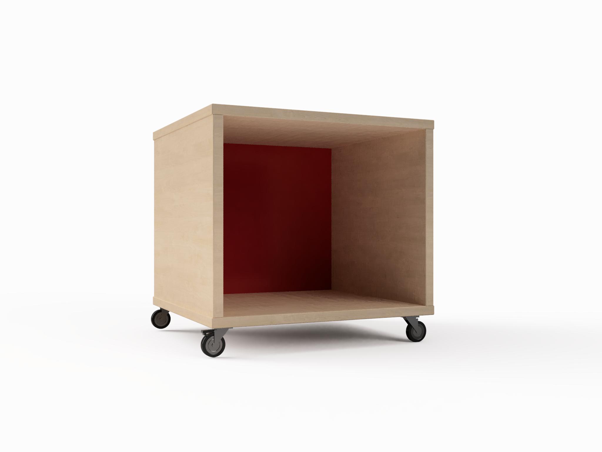 Ormar s jednim pretincem i pleksiglas leđima. Izrađen od materijala po izboru u debljini od 18 mm. Spajan je bez vidljivih spojeva. Ormarić s podnožjem na izbor: drvena sokla, metalni kotači i metalne nogice. Stražnja strana izrađena od istog materijala.
