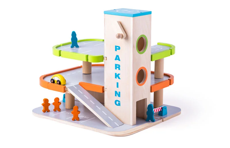 Parkirna garaža bez željeznice omogućuje kreativnu igru. Izrađena od kvalitetnog i izdržljivog drva. U skladu je sa sigurnosnim standardima.