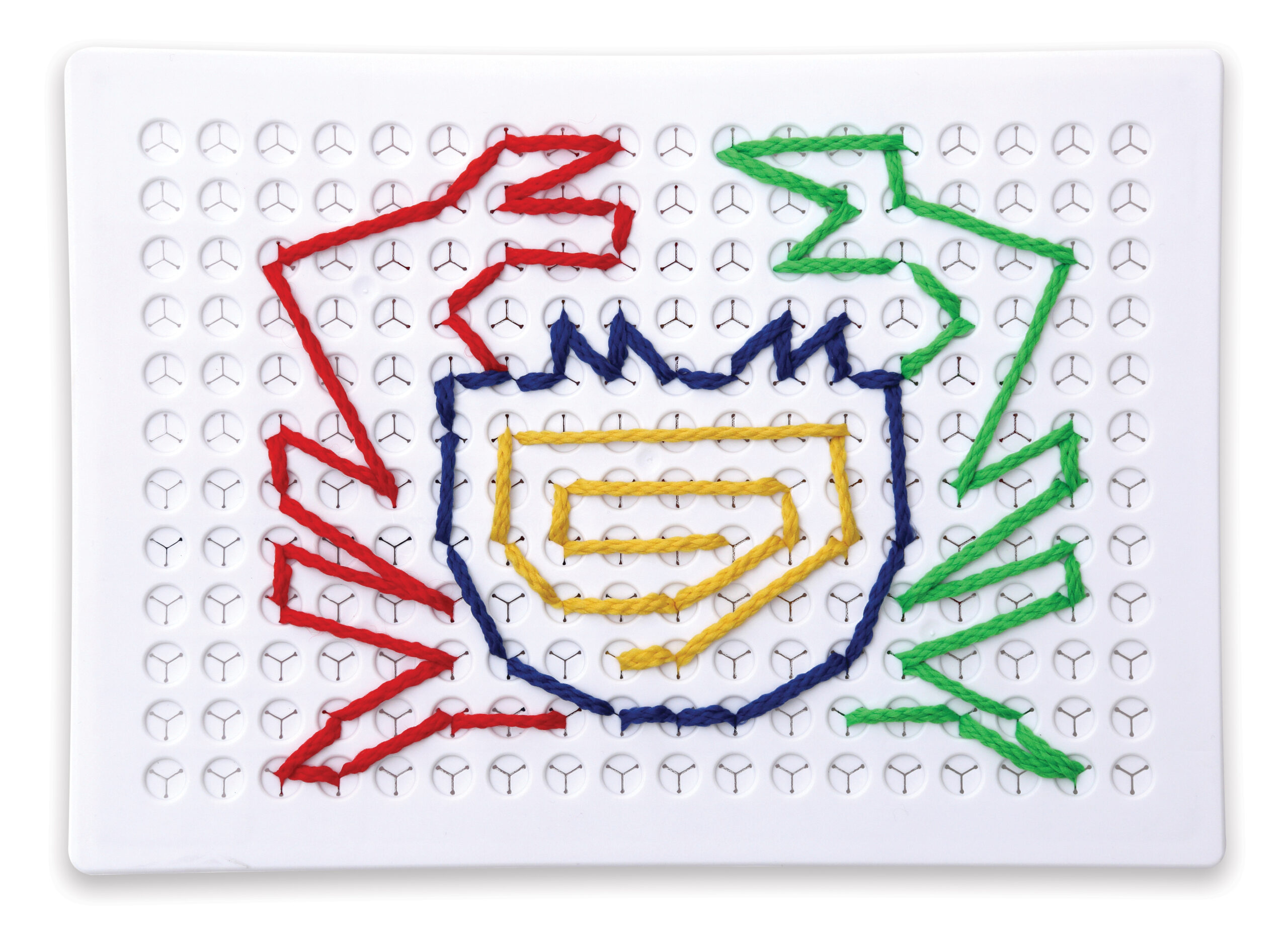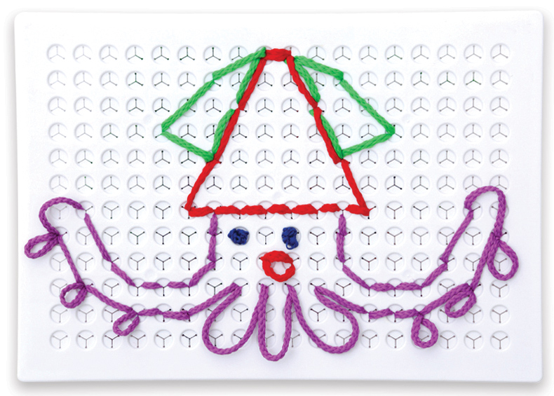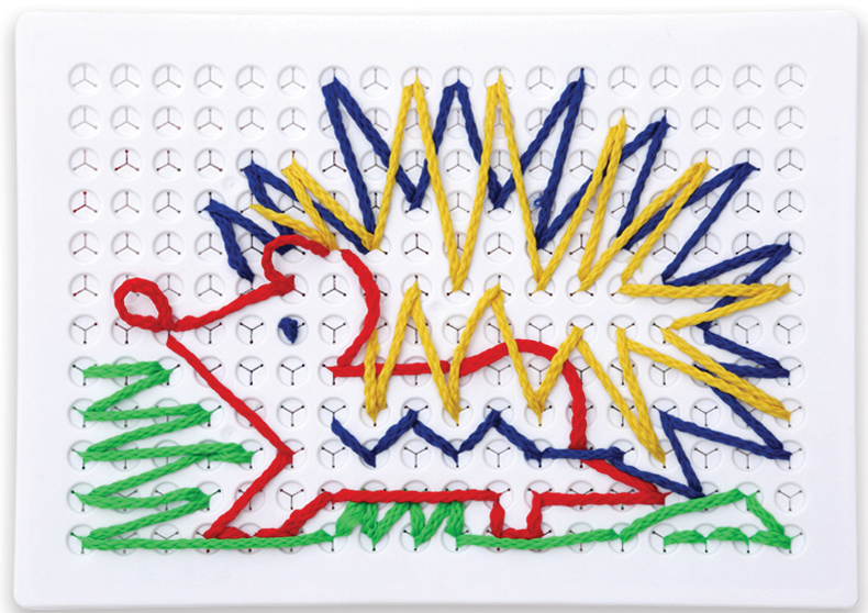 U set je uključena plastična podloga s utorima kroz koju se pomoću posebne olovke provlače žice. Ploča za šivanje potiče razvoj fine motorike djece bitne za životno praktične djelatnosti. Omogućena je izrada vlastitih slika ili korištenje priloženih uzoraka.