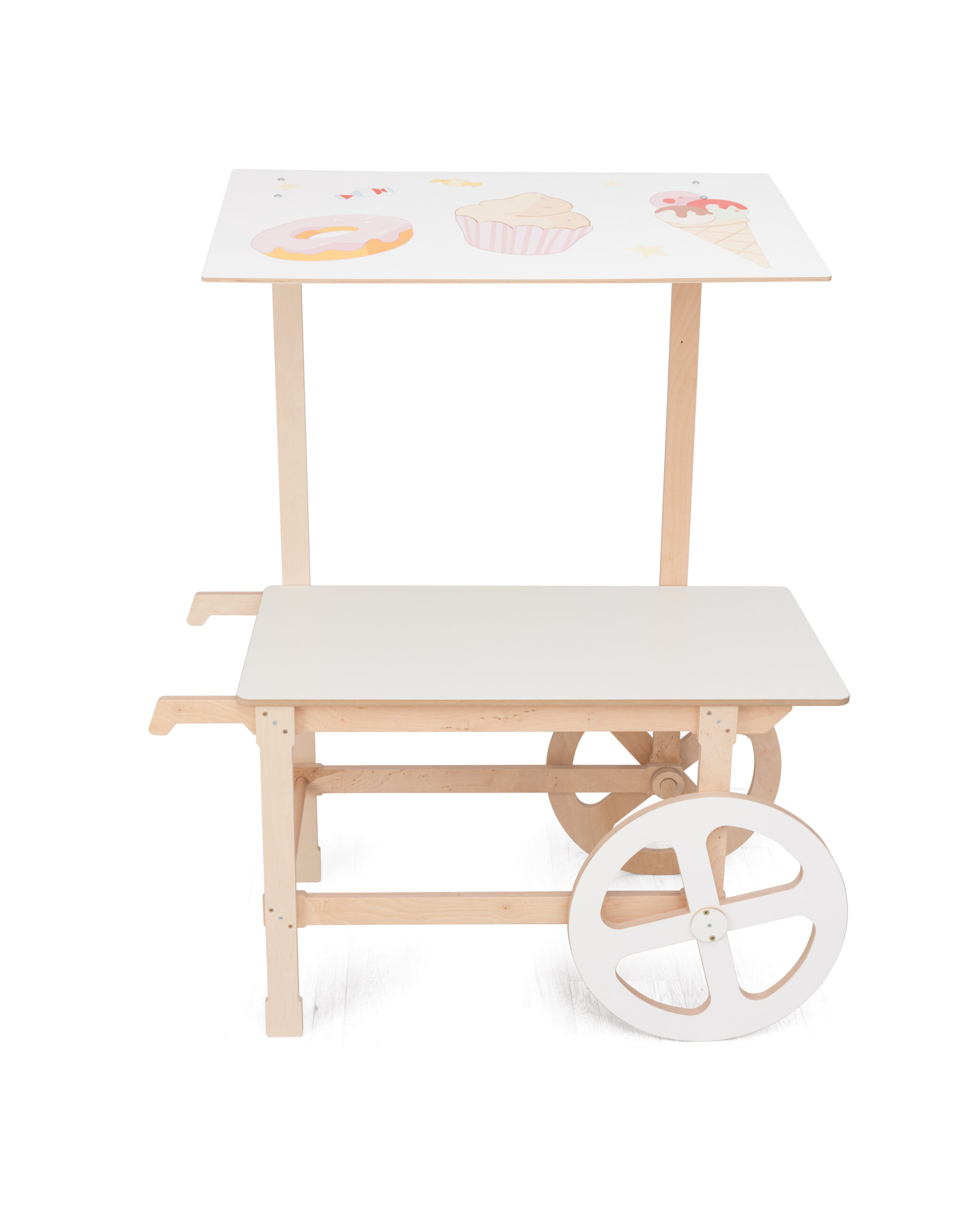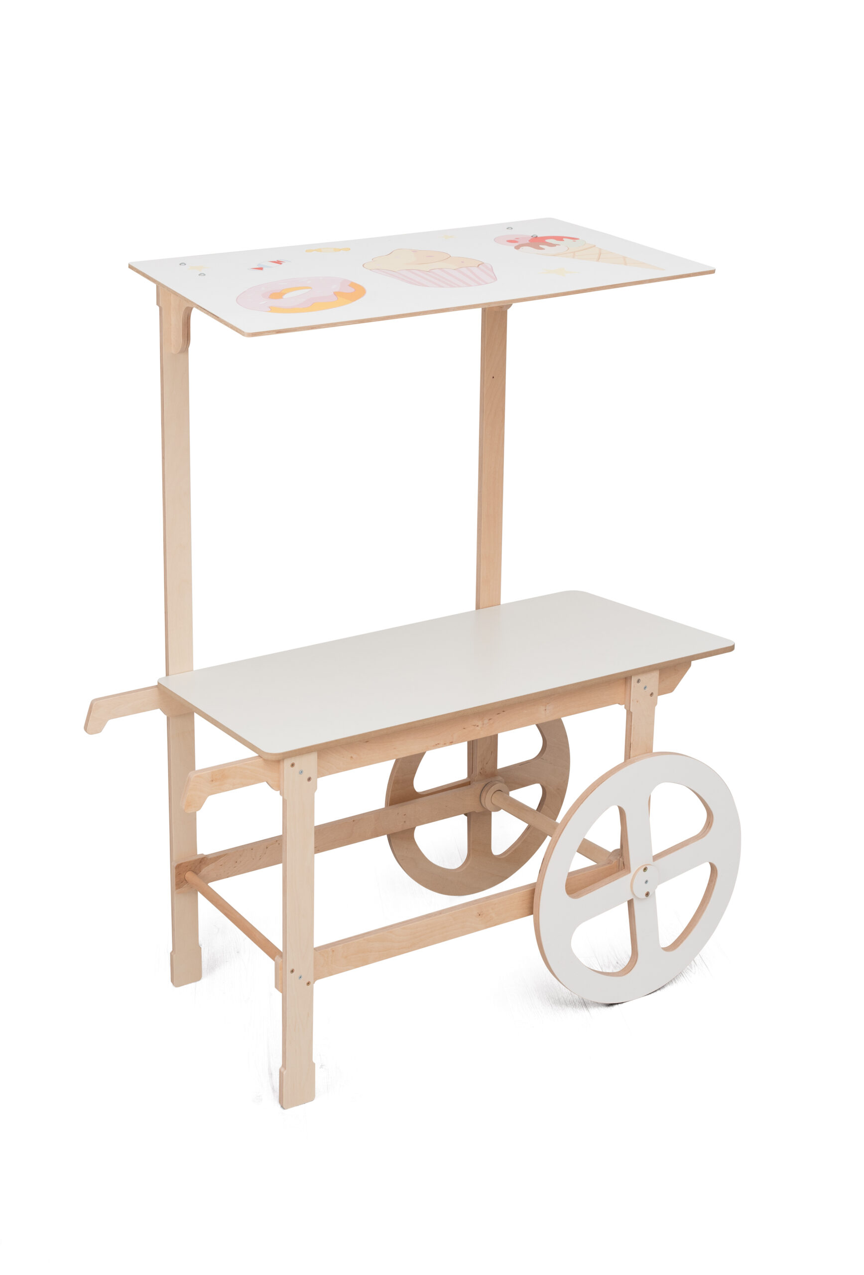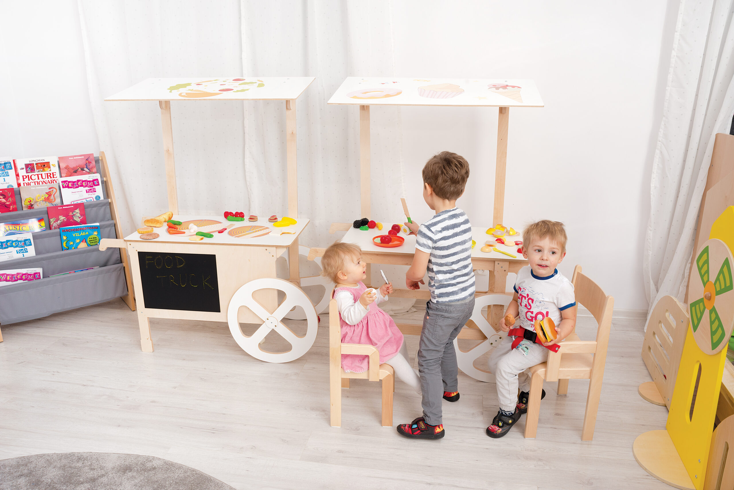 Tržnica je odlično mjesto za kreativnu i maštovitu igru. Djeca se vole igrati kupovanja i trgovanja, odnosno oponašati svakodnevne situacije. Stabilna i na kotačima za lako pomicanje. Drvena tenda koja štiti namirnice od sunca ili kiše.